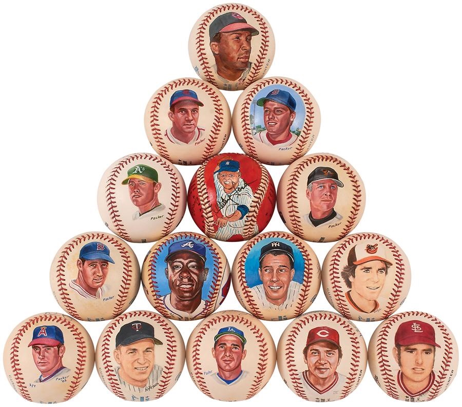 These beautifully hand-painted portrait baseballs are well-executed by the talented artist Greg Packer. There is some priceless stuff here with names to match: Koufax (PSA), Ripken Jr. (PSA), Aaron (JSA), Palmer (PSA), J. DiMaggio (PSA), and T.Williams (PSA). Also, Killebrew, Bench, Musial, F. Robinson, Ford and more. The Clemens and Ryan signatures are not authentic but the hand paintings by Packer are just as nice. Overall, the balls are EX and signatures average 7 to 8/10. A wonderful group.