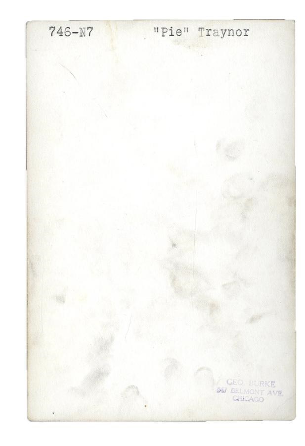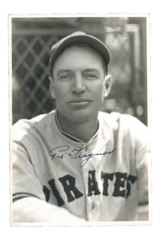 Talk about consistency. Hall of Famer Pie Traynor played 18 major league seasons, all at third base and all for the Pittsburgh Pirates. A gorgeous specimen, this photo is in Excellent condition, with the stampings of the great George Burke on the back. Traynor's beautiful signature is in 8/10 black fountain ink.