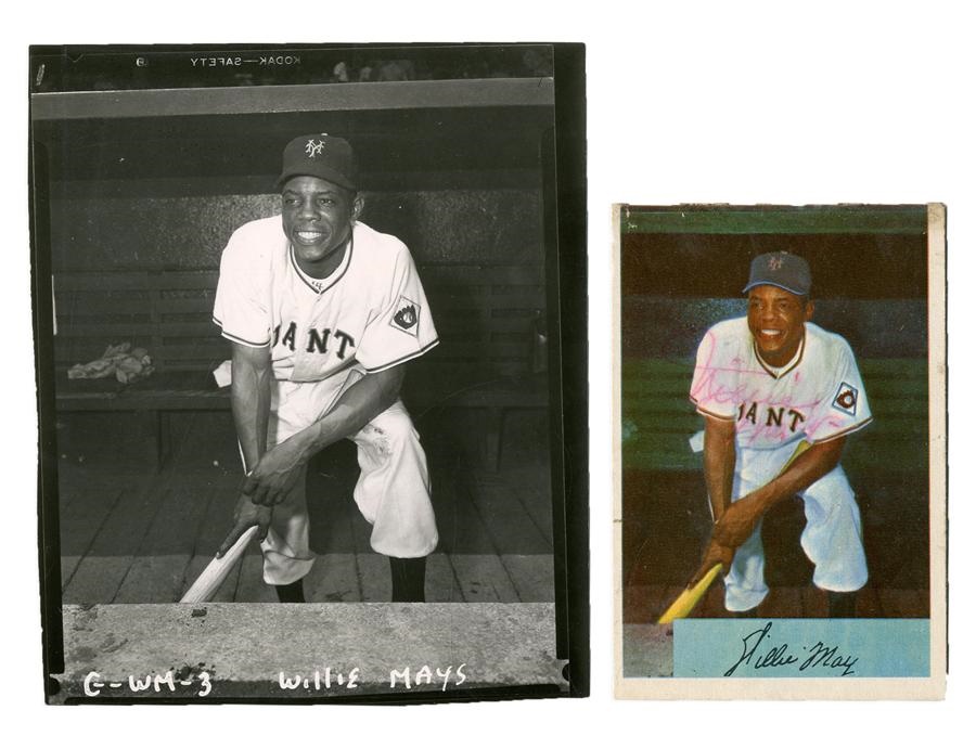 Here is the actual photo used to print Willie Mays' classic 1954 Bowman baseball card. In Excellent condition, this came right form the files of the Bowman baseball card company. All important serial numbers on the bottom front read "C--WM-3 Willie Mays." Comes with VG specimen of the card itself with red ink 5/10 signature. From his breakout season in the majors and his first world championship. Type I.