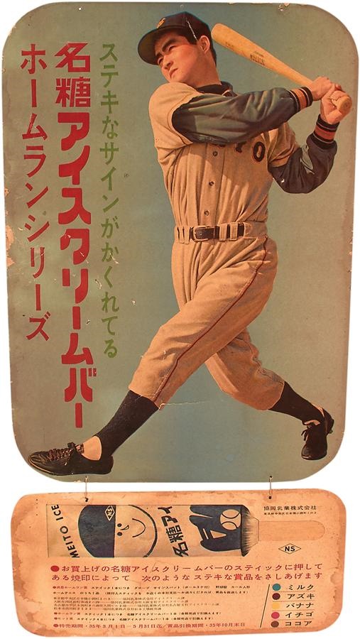 This is a handsome and vintage double-sided large 19x36" cardboard sign, which features an identical action pose of Shigeo Nagashima on both sides. It advertises Meito Ice Cream bars and the never-seen bottom promotional attachment is also included. The attachment explains the redemption promotion that occurred from March 1, 1960 through May 31, 1960. The lucky recipient of an ice cream stick that was imprinted "Grand Slam Home Run," "Home Run," or "Hit" would win a prize. Has some wear along perimeter, overall VG to VG+ condition.