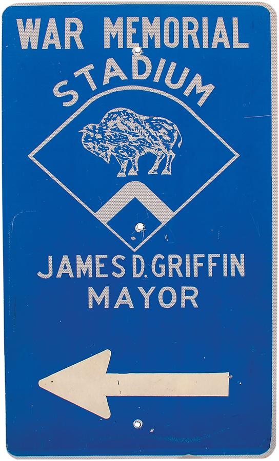 This steel highway sign is from the late 1970s or early 1980s and directed you to the stadium; it has two holes where it was bolted to the highway pole. Illuminates in brilliant blue "War Memorial Stadium" with the familiar buffalo mascot logo, and reference to James D. Griffin, Mayor, who was mayor for the longest period in history. Very thick and heavy, measures 24x42" with some wear, but overall in VG-EX condition.