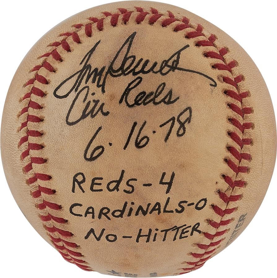 "Tom Terrific" was never better than the night of June 16, 1978. That's when Tom Seaver tossed his only career no-hitter, against the St. Louis Cardinals as the Reds won 4-0 at Riverfront. This baseball was used by Seaver to record one of his three strikeouts during his masterpiece. It is signed by the Hall of Fame hurler and also notated by him: "CIN REDS 6-16-78." In another hand is: "Reds 4, Cardinals-0, No Hitter, One of the strikeout balls from Tom Seaver no-hitter June 16, 1978." The Official National League (Feeney) baseball shows nice use and was obtained from the collection of the Ohio Baseball Hall of Fame.