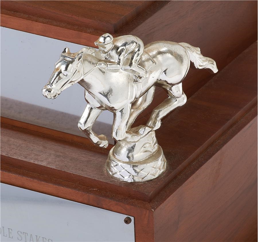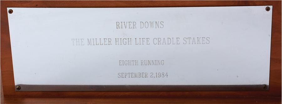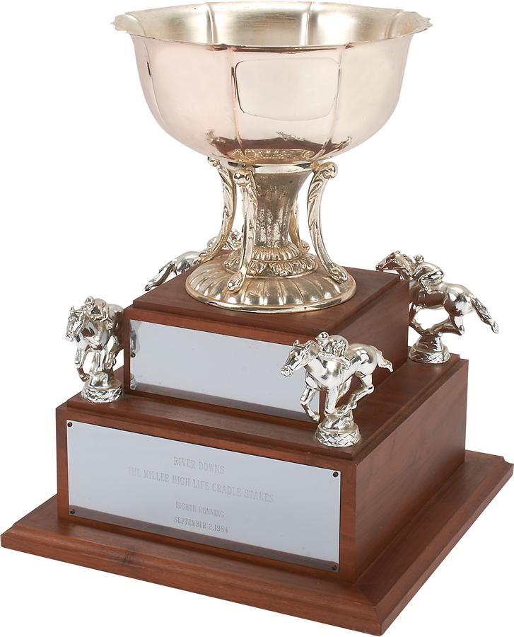 Presented for Spend A Buck's win at River Downs in Cincinnati, Ohio, this solid and heavy silver trophy is from the sprint which grew to become the richest race for 2-year-olds in Ohio. This Kentucky Derby Winner (Spend A Buck), two Horses of the Year, two Derby second-place finishers, and a number of graded stakes winners have graduated from the Cradle Stakes. This trophy is extremely ornate, including the base. Consisting of three tiers on wood, the second tier has multiple silver race horses with riding jockeys. The plaque reads "River Downs, The Miller High Life Cradle Stakes, Eighth Running, September 2, 1984." In Excellent condition and comes with a photo of the Winner's Circle with this trophy presented. From the collection of the owner, Dennis Diaz.