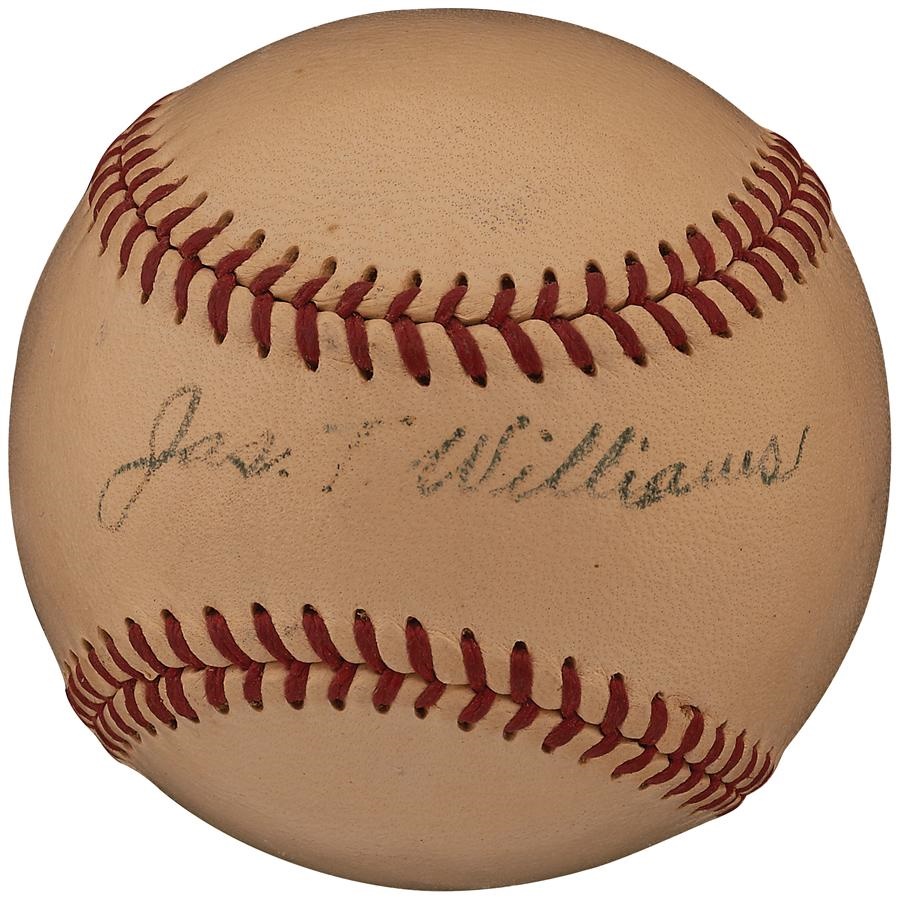 Second baseman Jimmy Williams was an original New York Highlander in 1903, when he batted .267 in his fifth big-league season. The speedy and powerful Williams remains one of the tougher "getable" Yankee single-signs, so here's your chance to grab an elusive treasure. The Harridge Official American League baseball is beautifully signed, James T. Williams, and grades 8.5/10. Williams led the league in triples three times during his first four major league seasons. This ball came from the Barry Halper Collection.