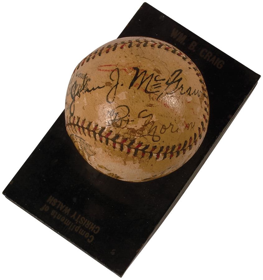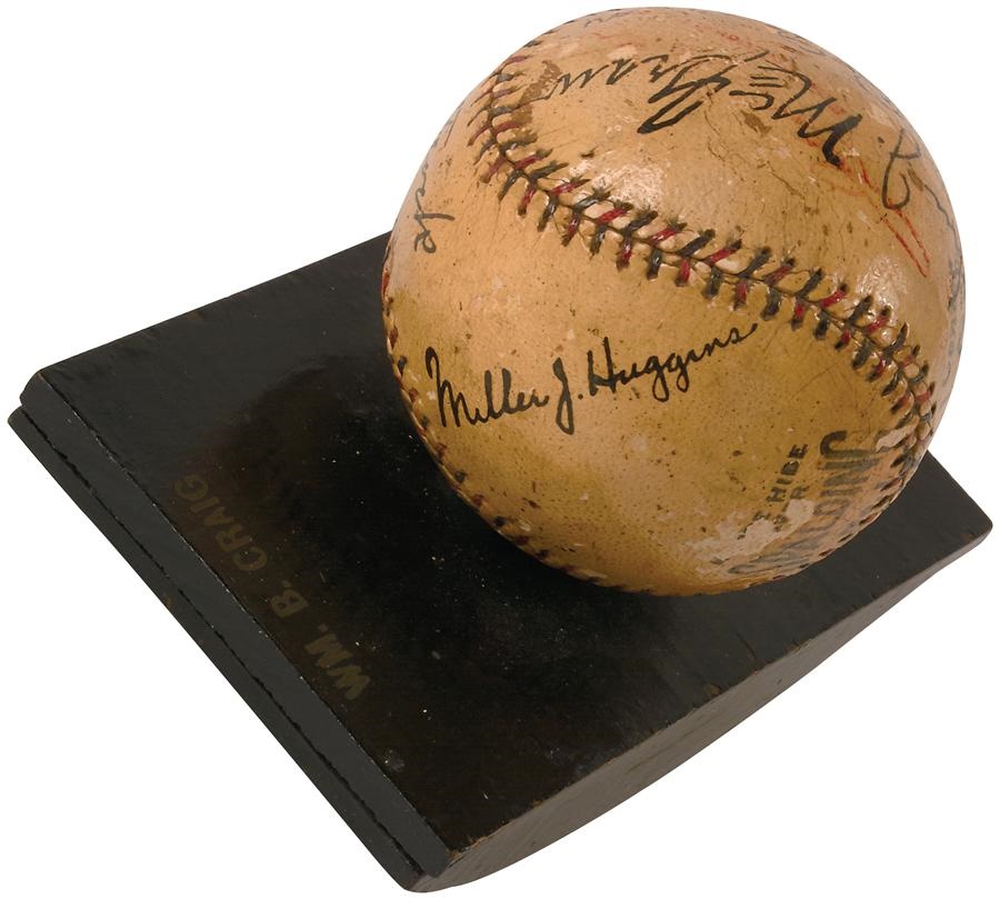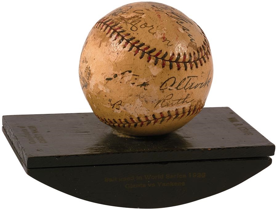 The first World Series at Yankee Stadium was historic, and so is this baseball, that includes the signatures of Bomber greats Babe Ruth, John McGraw and Miller Huggins, whose autograph is exceedingly rare. However, the toughest signature here belongs to 1919 Reds manager Pat Moran, who died in 1929. The ball mounted on wood base was a blotter gift that was given out during an event organized by Ruth's agent, Christy Walsh. The Official American League ball, whose president's name is obscured, is signed in black fountain ink and includes the name Nick Altrock, and the McGraw signature is on the sweet spot. The McGraw, Huggins and Moran autographs are very bold and among the finest examples for each that you will come across. Minus a couple of imperfections, the three examples grade 9/10. The Altrock and Ruth signatures are each affected by numerous surface marks and grade 6 and 4, respectively. Each of the signers on this ball was a celebrity columnist for the Christy Walsh Syndicate, and presentational baseballs such as this were commonly handed out to syndicate representatives. This one happens to have been given to "WM. B. CRAIG."