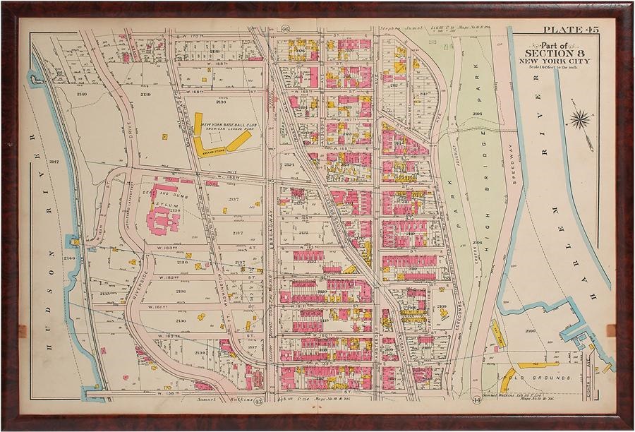 This marvelous map of the of some Bronx neighborhoods features lovely, hand-painted pastel overtones. Clearly, the map does not reflect the recent restructuring and relocation of Yankee Stadium, but the old location, as well as the Polo Grounds across the river, offers a unique glimpse into the borough's past (as evidenced by the demarcation of the "Deaf and Dumb Asylum"). Measuring 24x34" and highly detailed, this piece is framed and would look super displayed on a wall or as part of a historic showcase. Comes professionally folded and in beautiful condition.
