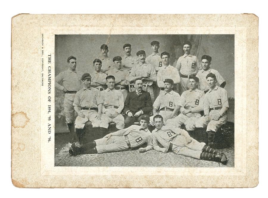 Keeler, McGraw, Robinson, Jennings and Kelley. Just a few of the Hall of Famers on the late 1890s Baltimore Orioles, who are showcased on this oversized team cabinet during their late 19th Century three-peat under manager Ned Hanlon. The National League O's were the originators of the "Baltimore Chop" and this 7.25x5" keepsake was created in the studios of renowned photojournalist Dave Bachrach. "THE CHAMPIONS OF 1894, '95 AND '96" is printed along the left side and there is a 5" crease near the top-center. As expected, there is some soiling and discoloration but that hardly diminishes its historic value, which is immeasurable for Baltimore collectors or 19th century baseball enthusiasts.