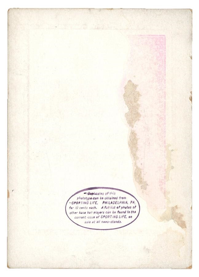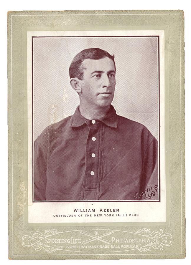 One of the rare few who suited up for all three of New York's classic ballclubs, Willie Keeler is resplendent in his dark uniform circa his Yankees years of 1903-10 in this Sporting Life cabinet photo. There is some staining on the back that seeps a bit through the front but otherwise rates VG+.
