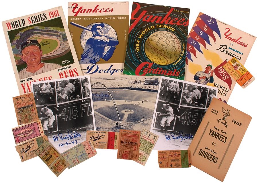 A bundle of Bronx Bombers collectibles comprise this championship-caliber lot. Some of the tickets have some back damage but several come from Wold Series-clinching contests, such as 1936, 1939, 1956 and 1958. In general, they range from VG to EX. The programs are from 1953, 1955, 1961 and 1964, averaging EX. There's also a radio scorecard that is unmarked, and three glossies autographed in 1947 by Al Gionfriddo in blue Sharpie (10/10), one of which is dated October 5, 1947, when the left-fielder made his famous snare of a scorching Joe DiMaggio liner kept Brooklyn alive in Game 6.