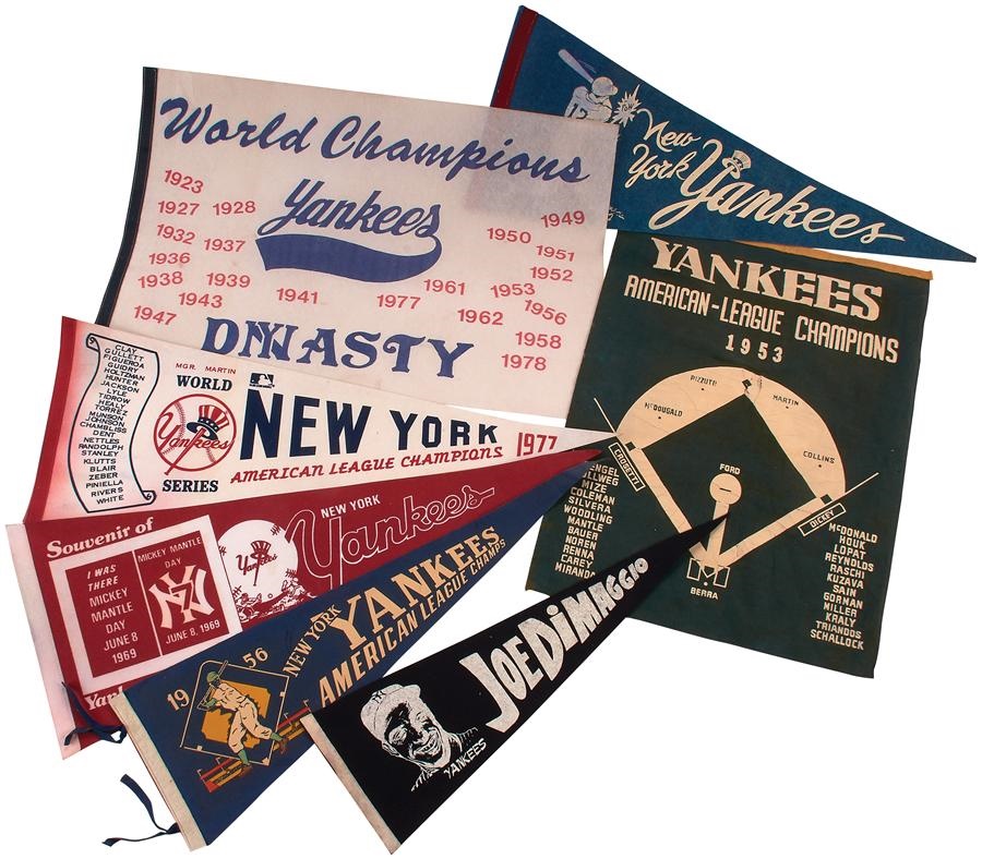 Talk about Flags of our Fathers! This fascinating collection of rare pennants from the Yankees' iconic past includes one relic dated 1956 featuring a diamond with player names listed but has a cut in the center. There's also a 1960s team flag, 1953 banner that measures 17x24" and is trimmed at the bottom, a Joe DiMaggio repro, 1977 World Series souvenir and one from Mickey Mantle Day in 1969.