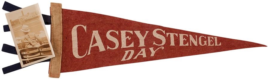 The Yankees retired celebrated manager Casey Stengel's number in 1970 and this rare pennant that we have never before encountered appears to have come from another "Casey Stengel Day" long before, perhaps after he retired as a player in 1925. This very pennant is evident in an enclosed faded photo and is in EX condition overall. The only man ever to have worn the uniform of all New York baseball teams was inducted into the hall of Fame in 1966.