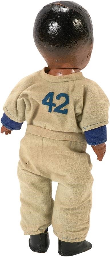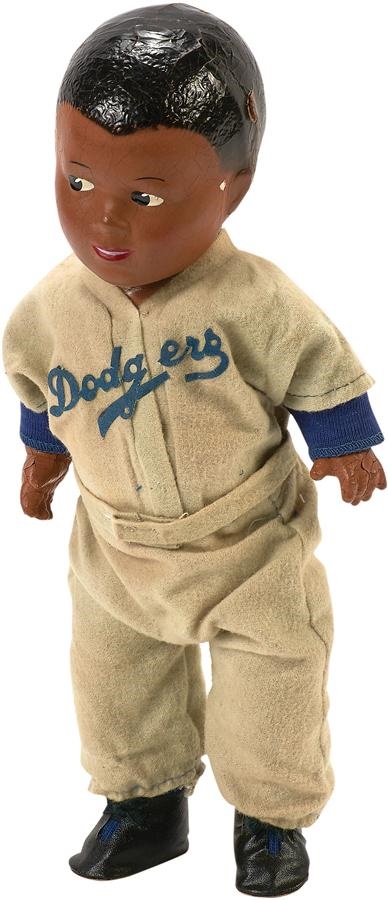 The man who broke baseball's color barrier - Jackie Robinson - appeared in doll form, circa 1949. Here he is clothed with the iconic "42" on his back in Dodger blue. There is no jacket, hat, bat or box and there are paint chips and cracks on head, feet and hands but the jersey is a thing of beauty, plus the pants and shoes are in good shape. The doll stands approximately 13" tall and was manufactured by Allied-Brand Doll Mfg.