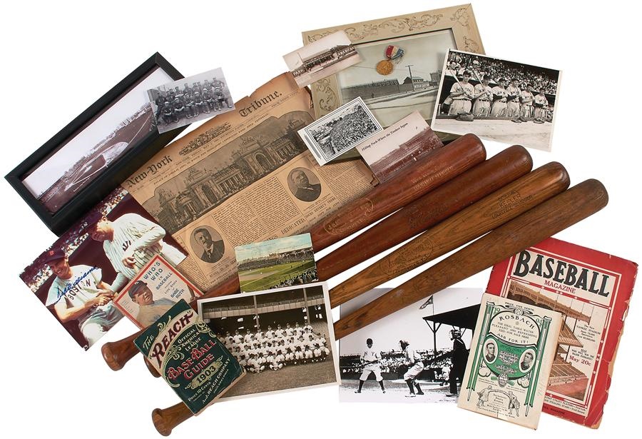 This interesting group of material includes the following: 1) 1904 NY Highlanders program vs. Boston with Griffith and Keeler on the cover. Good condition. 2) Type I wire photo of the 1939 Yankees, who smashed 13 home runs in one day (DiMaggio, Dickey, etc.). 3) 1903 Reach Baseball Guide, first year of the Highlanders. VG-EX. 4) 1921 Who's Who in Baseball with great Babe Ruth cover, back cover is missing. 5) 1910 Hilltop Park postcard. 6) Six various modern prints of Highlanders photos, some framed. 7) Gorgeous 1958 Yankees 8x10" team photo, NM, Type I. 8) "American League 1927 Champs" "Fantasy" medal. 9) Ted Williams and Babe Ruth color 8x10" signed by Ted Williams. 10) New Yankee Stadium 1923 Baseball Magazine cover issue with great articles/photos inside. 11) May 1, 1903, New York Tribune complete newspaper for Opening of Yankee Stadium. 12) Four great Wee Willie Keeler store model bats: Spalding Gold Medal (30.5" length, heavy), early LS 125 "Keeler" (30.5" length, nice!), JF Hillerich & Son "Wee Willie Keeler" model (30" length), Keeler "Whip Action" (35" length). Overall EX condition.