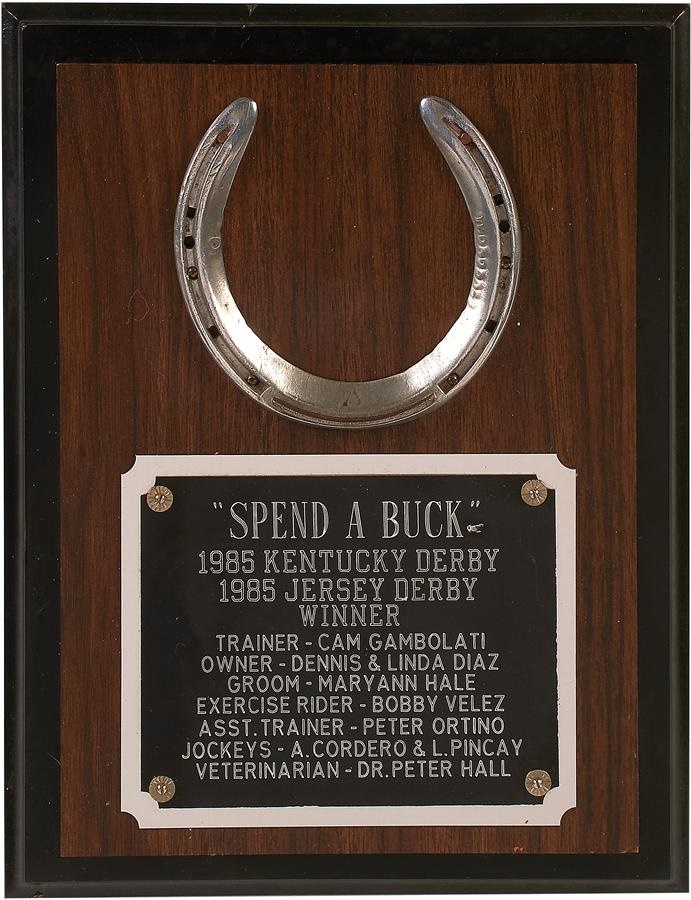 You may never step into the shoes of a champion, but you can certainly own one. From the collection of owner Dennis Diaz, this horseshoe was worn during Spend A Buck's Horse of the Year season of 1985, when he captured the Kentucky Derby in fleet 2:00 1/5 time. The shoe mounted on this plaque may have been worn in the Derby, though we are not able to confirm that. The plaque reads: "Spend A Buck, 1985 Kentucky Derby, 1985 Jersey Derby Winner" with all persons associated with the horse listed below, including the trainer, owner, groom, exercise rider, assistant trainer, jockeys and even his vet. It is in EX-MT condition.