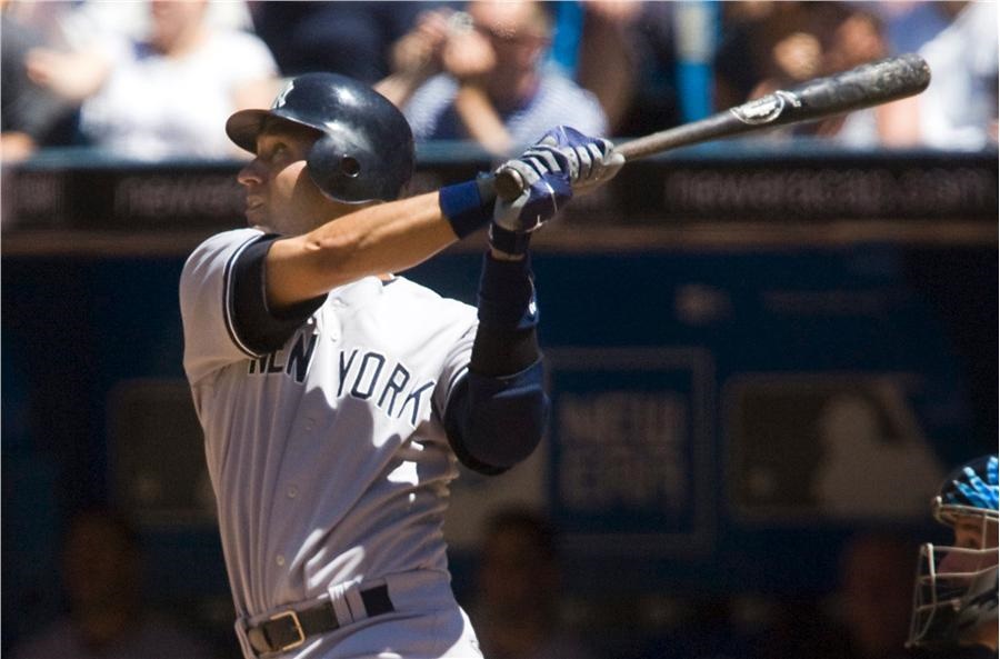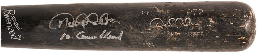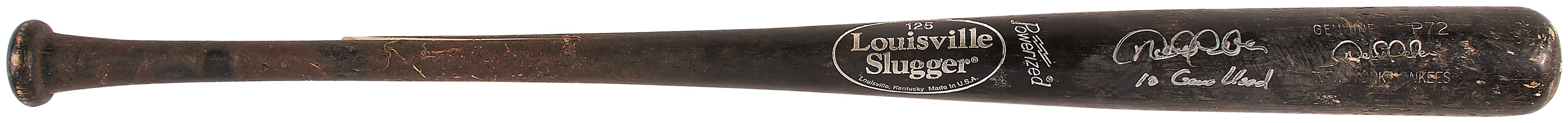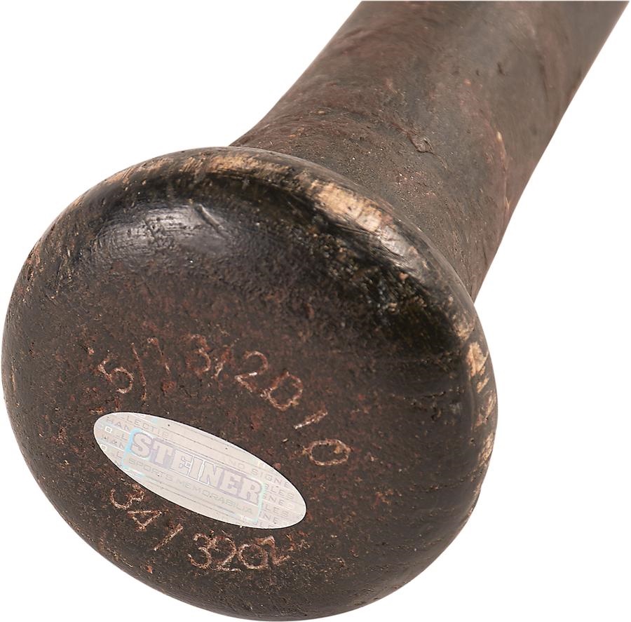 Not known for his power, future Hall of Famer Derek Jeter did manage to "go yard" 260 times over his 20-year career. This gorgeous black bat was partly responsible for long ball #230, which was a go-ahead, two-run shot against the Blue Jays at Toronto's Rogers Centre on June 5, 2010. The blast was Jeter's 6th homer of the season (career #230) and shows tons of use. There are photos showing this to be an EXACT match to the end of the bat, and one pic comes directly from the Associated Press. The bat is cracked, measures 34", shows terrific game use and is inscribed "10 Game Used" in silver. Comes with a Steiner LOA and Steiner Cert Card.