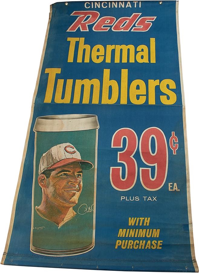 This extremely rare cloth served as an advertising banner for the best cup in the set. This popular set of Cincinnati Reds thermal cups were issued in 1966 and distributed at gasoline stations, and the fabulous artwork was done by well-known sports illustrator Nicholas Volpe. Banners of the players are known, but this is the only known specimen with Pete Rose on it. The banner is a masterful seven feet tall and 3.5 feet wide, displaying gorgeous colors. These were hung in the Cincinnati area outside of Tressler Comet Gas Stations, where you could buy one of these nifty cups for 39 cents plus tax. Very Good condition with original grommets at top for hanging.