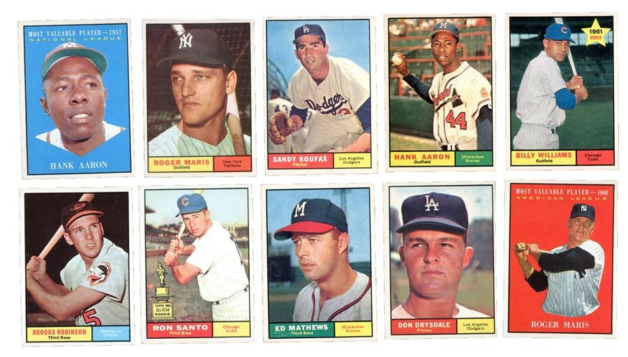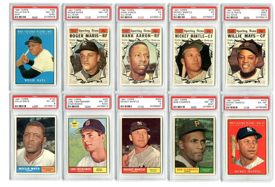 A sharp-looking set that was assembled one card at a time. Overall, we would grade it EX to EX-MT. Some of the cards are graded by PSA and include: Mays (6), Yastrzemski (8 OC), Mantle (5), Clemente (8 ST), Mantle MVP (6), Mays MVP (8 PD), Maris All-Star (8), Aaron All-Star (5), Mantle All-Star (5) and Mays All-Star (9 OC). Other stars that are not slabbed: Aaron (EX-MT), Kaline (EX-MT), Spahn (NRMT), Drysdale (EX), B. Robinson (NRMT), Santo (EX), B. Williams (EX-MT), Maris MVP (NRMT), Aaron MVP (EX+), Maris (EX+), F. Robinson (EX+), Koufax (EX+) and Musial (EX-MT). Only three cards are missing: #350 (Banks), #361 (Checklist) and #563 (Cerv).