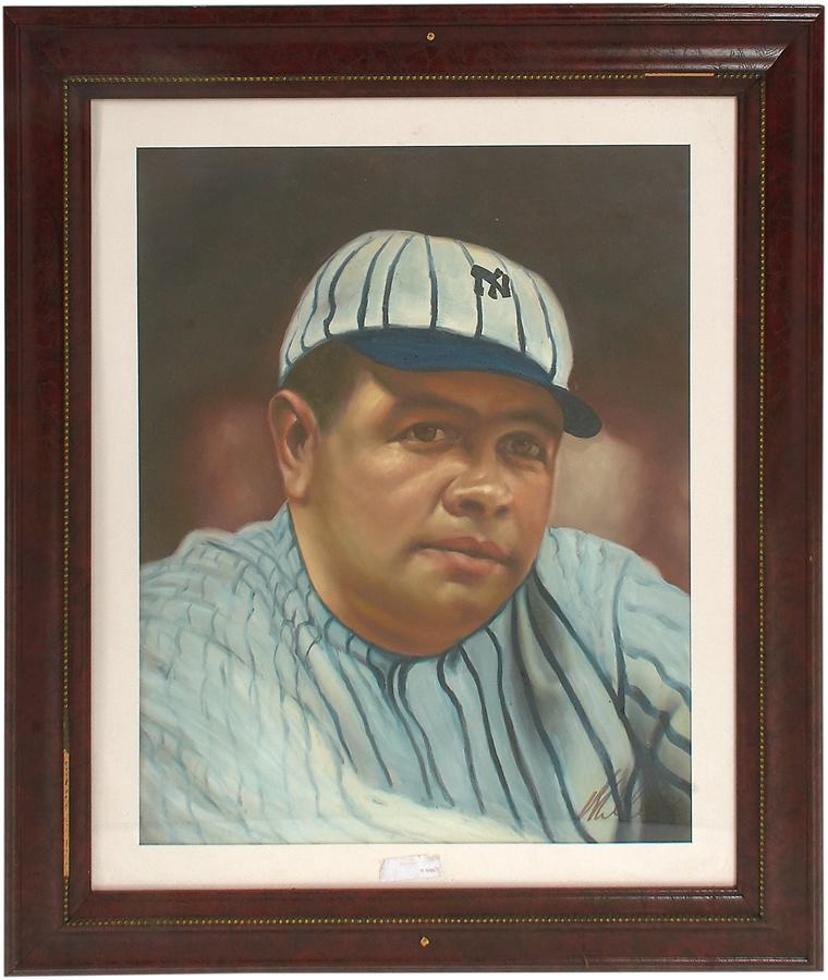 A plaintive Babe Ruth minus his natural swagger provides a different look for the Sultan of Swat in this excellent likeness on acrylic. The artist's name - Miller - is written on the bottom right, and his piece measures 35x42.5" in its frame, which has holes on the lower and upper center, presumably from previous mounting. There is also some damage to the lower left-corner of the frame but the work displays quite nicely nonetheless.