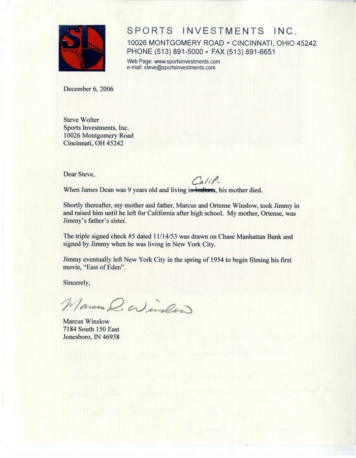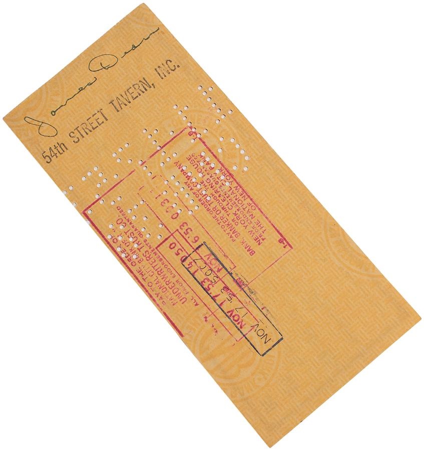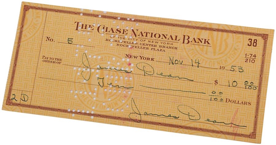 Even though he only acted in seven films, James Dean remains a Hollywood legend. This very rare check, completely filled out in the star's hand, originates from the time Dean was living in New York City, as it is drawn from Chase Manhattan Bank. On the front, it is dated Nov. 14, 1953, seven months after the release of Dean's fourth film "Trouble Along the Way" and made out to the star... an autograph in itself! The amount is 10 dollars and it is both signed by Dean at the bottom right and endorsed by him on the back. There are typical cancellation marks, otherwise the check is EX-MT with writing and signatures in 8/10 in blue ink. Several of these checks came out from Marcus Winslow, the son of the couple who raised James Dean after his mother passed away when he was nine. It comes with a letter from Winslow. Dean was killed in a car accident less than two years later at the insanely young age of 24, further cementing his legacy as a cultural icon.