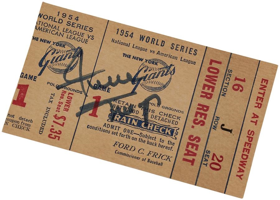 It is known simply as "The Catch." Willie Mays robbed Vic Wertz of a potential home run to dead-center at the spacious Polo Grounds, making an over-the-shoulder grab at full speed with two men on base, helping preserve a 2-2 tie in the top of the eighth inning. This ticket from that unforgettable game is EX-MT and is also signed by Mays in 7.5/10 black Sharpie. Mays' New York Giants went on to win 5-2 on a pinch-hit, three-run blast by Dusty Rhodes. That homer and Mays' catch spring-boarded the Giants to a four-game sweep of the mighty Tribe.