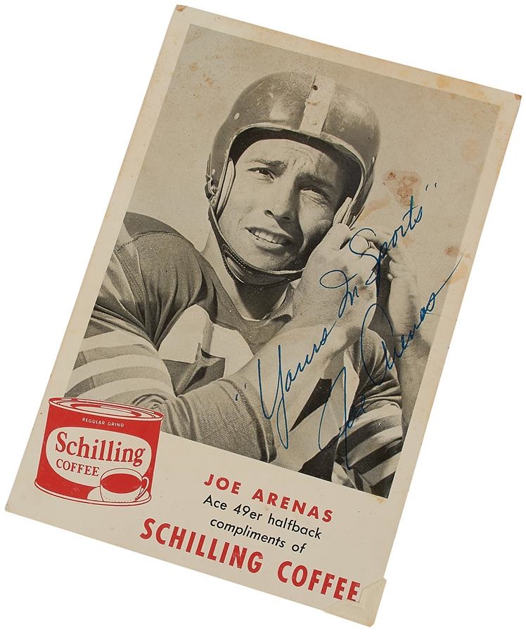 Halfback and defensive back "Lupe Joe" Arenas played for the San Francisco 49ers between 1951 and 1957, and he signed this ultra-rare 4x6" card in blue with the inscription: "Yours In Sports." There's a pinhole on the helmet and small piece of tape on the back, otherwise VG condition. The year of production is not known but this is the only known card that was signed. Arenas' 4,572 career kick and punt return yards was the best in NFL history at the time of his retirement.