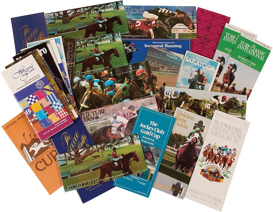 Listed as #23 on the list of 100 Greatest Racehorses of the 20th Century, Hall of Fame gelding John Henry was a two-time Horse of the Year, and here are many of the major programs from his sensational career, which spanned the early-to-mid-1980s. There are more than two-dozen booklets here and they average EX condition.