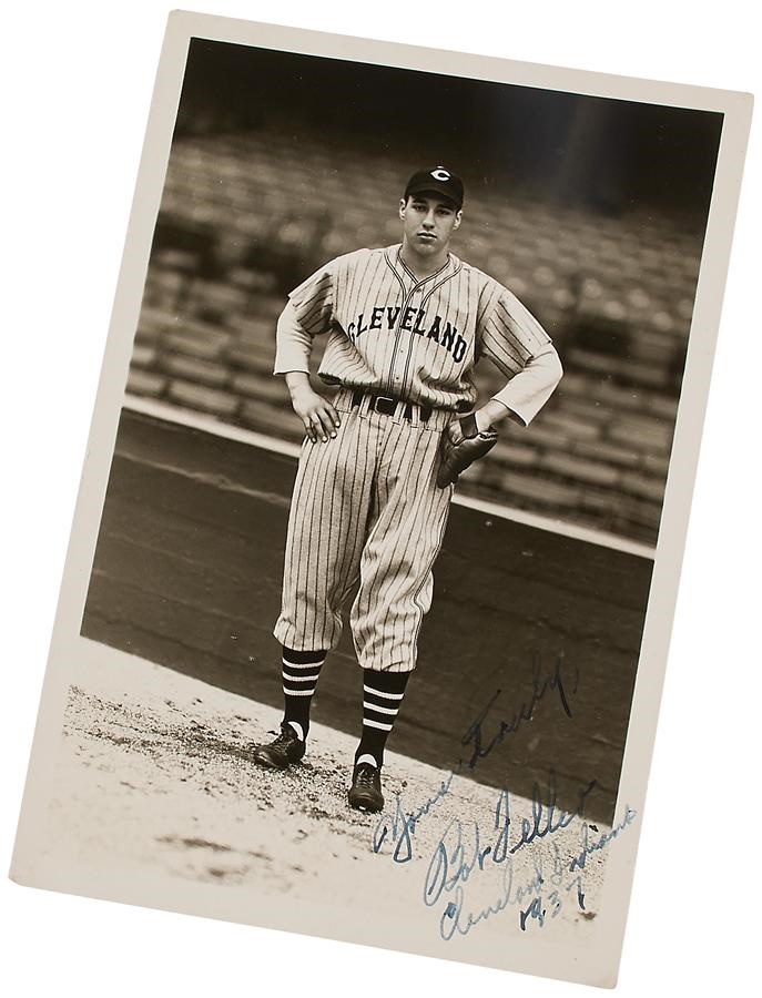 Yes, his signature is common, but this one was signed by Bob Feller and dated in 1937 when the future Hall of Famer was but a young pup. The photo of a teenage Feller is EX and has his name typed on the back. It is signed in 6.5/10 fountain ink: "Yours Truly, Bob Feller, Cleveland Indians 1937."