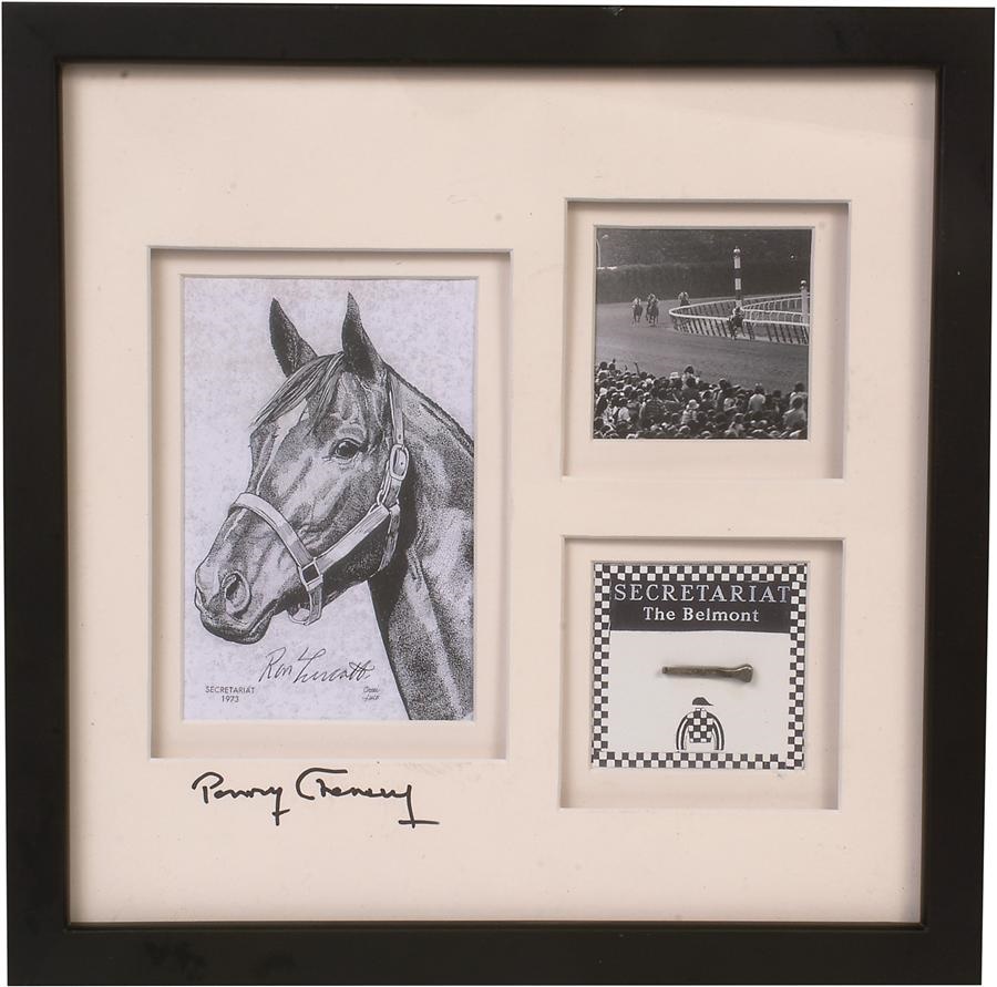 The Belmont nail, titled #SEC060973jgfr3131, in the Secratariat.com inventory, is part of a framed montage created by the late Jim Gaffney, the well-chronicled exercise rider intimately involved with the day-to-day activities of Secretariat in 1972-1973. Along with groom Eddie Sweat, he held Secretariat whenever he was shod and began acquiring the shoes and nails of the great champion from his maiden race forward. The featured nail was originally obtained on June 26, 1973, when Secretariat was re-shod by Meadow Stable farrier George Collins, seventeen days after winning the Belmont Stakes by 31 lengths, setting a new and still existing world record for 1 1/2 miles on dirt to complete his Triple Crown sweep. The performance was perhaps the most defining race in Secretariat’s career, and considered one of the top ten sporting achievements of the 20th century (Sports Illustrated, 2004). One of only a handful to exist - each individually cataloged and officially documented - it was initially sealed inside a brown envelope within the original shoe box. The nail has been kept in protected storage in the continued possession of either Mr. Gaffney or the Secretariat Archives since its acquisition more than 42 years ago. The impeccable provenance and historical significance cannot be overstated as the corresponding set of Belmont shoes in which the nails were removed reside in the collection of the National Museum of Racing in Saratoga Springs, New York. Framed to 12" x 12" it is hand-signed by Secretariat's owner, Penny Chenery, and with graphite illustration of Hall of Fame Jockey Ron Turcotte, and a small image of Secretariat rounding the stretch turn in his Belmont Stakes victory. The framed nail montage, one of only a few ever made, was personally assembled by Mr. Gaffney November 17, 2004, with his own handwritten comments regarding the nail and its authenticity prominently featured on the reverse of the matting. [Additional Secretariat Archive images are shown here including original 1973 handwritten notes from Mr. Gaffney documenting the shodding and acquisition date. Copies can be made upon request.]