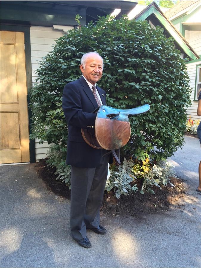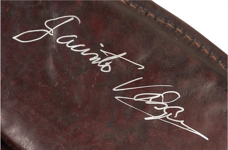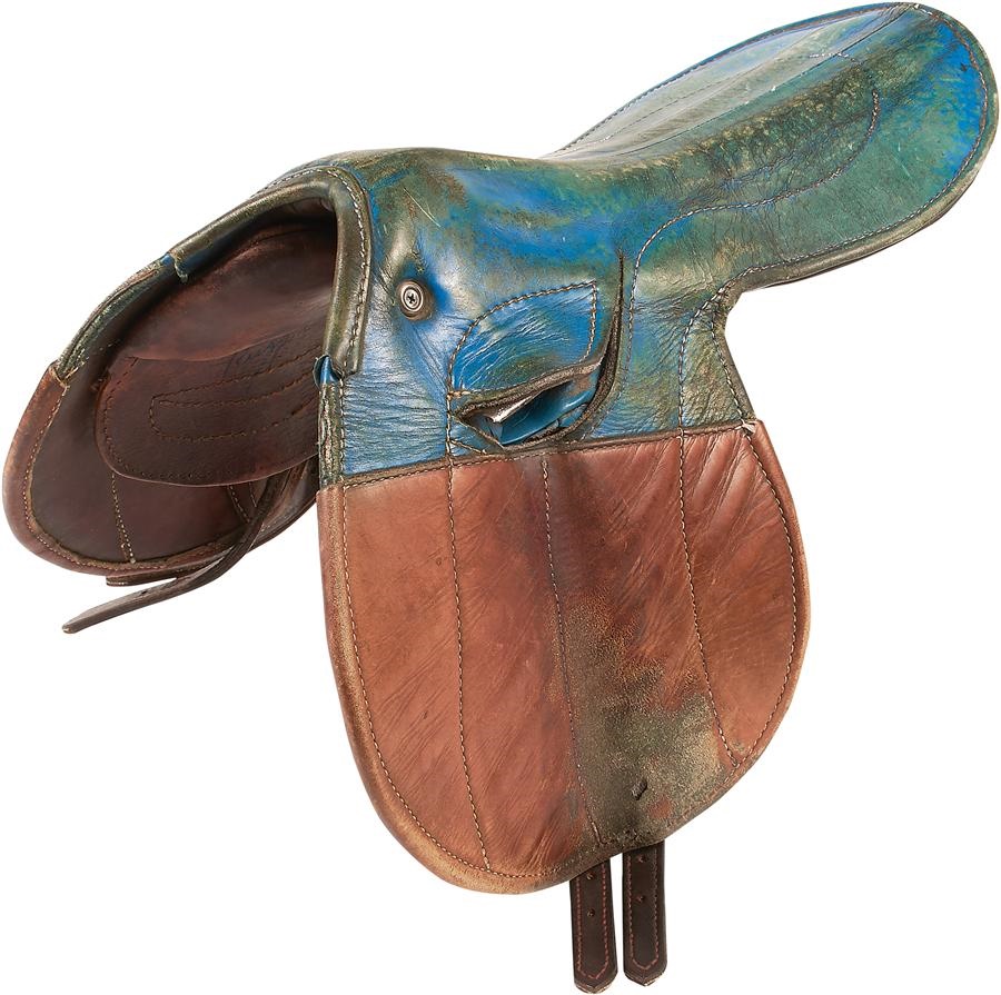 From the personal collection of jockey Jacinto Vasquez. A saddle filled with sentiment and history. Personally used by Jacinto Vasquez while working for Hall of fame trainer Frank Whiteley. Worn repeatedly during the jockeys morning workouts on racing greats from the Whiteley barn including Ruffian and Forego, and most likely worn by other Whiteley-trained champion Damascus. Vintage leather saddle probably dates back to the sixties and was used by those working in the barn for morning workouts and exercise riders. Time-worn saddle was a particular favorite of Vasquez's. Whiteley and Vasquez struck up a friendship which endured for more than a quarter of a century which saw Vasquez first ride for the legendary trainer in 1963, ultimately becoming his regular rider in the mid-seventies and given the mount on the great Ruffian. Vasquez continued working for Whiteley all the way up until the trainers retirement in 1984. In the late seventies, Whiteley gave Vasquez the familiar and sentimental saddle as token of appreciation for the jock's devotion to Ruffian as well as his years of service and friendship working together in the barn. The saddle is hand-signed by Vasquez and has accompanying photo taken this year at Saratoga Race Course during the 2015 Hall of Fame ceremonies.