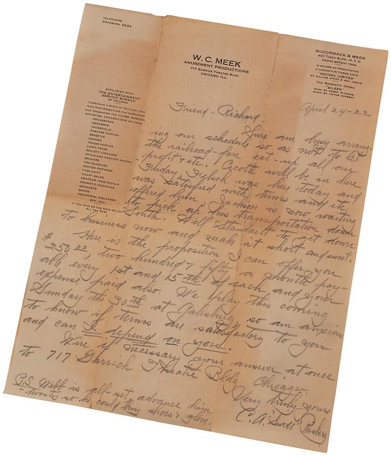 The Black Sox scandal is approaching an infamous 100-year anniversary in three years, and anything associated with that baseball black eye still piques curiosity. That's certainly true with this one-page letter written in 8/10 pencil that was sent to fan and game organizer "Richard" Standaert. There is great content here in regard to organizing a barnstorming game with the Black Sox players: "Cicotte will be in here Friday, Felsch was here today and was satisfied with the terms and etc. offered him. Jackson is now waiting to pick up his transportation down South." It is signed "C.A. 'Swede' Risberg" and features a great postscript that reads: "Webb is all set, advance him twenty so he could buy shoes + glove." Risberg is a tough signature and it is rarely if ever seen in this handwritten letter format with such terrific historic content. The letter displays typical mailing folds on "W.C. Meek Amusement Productions" letterhead.