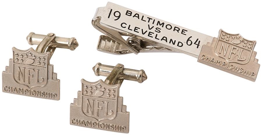 December 27, 1964, was a day of jubilation in Cleveland as the beloved Browns football team blasted the Baltimore Colts to win the NFL title, 27-0 - the last professional championship the city has won to date. These cufflinks and tie bar were given to the media who covered the game at Municipal Stadium that afternoon, and there were plenty of reporters on hand as this was the first nationally televised NFL Championship Game. The items feature the NFL logo and the word "CHAMPIONSHIP," while the tie bar also identifies the participants (BALTIMORE VS. CLEVELAND) as well as the year. Each of the items is in NRMT condition.