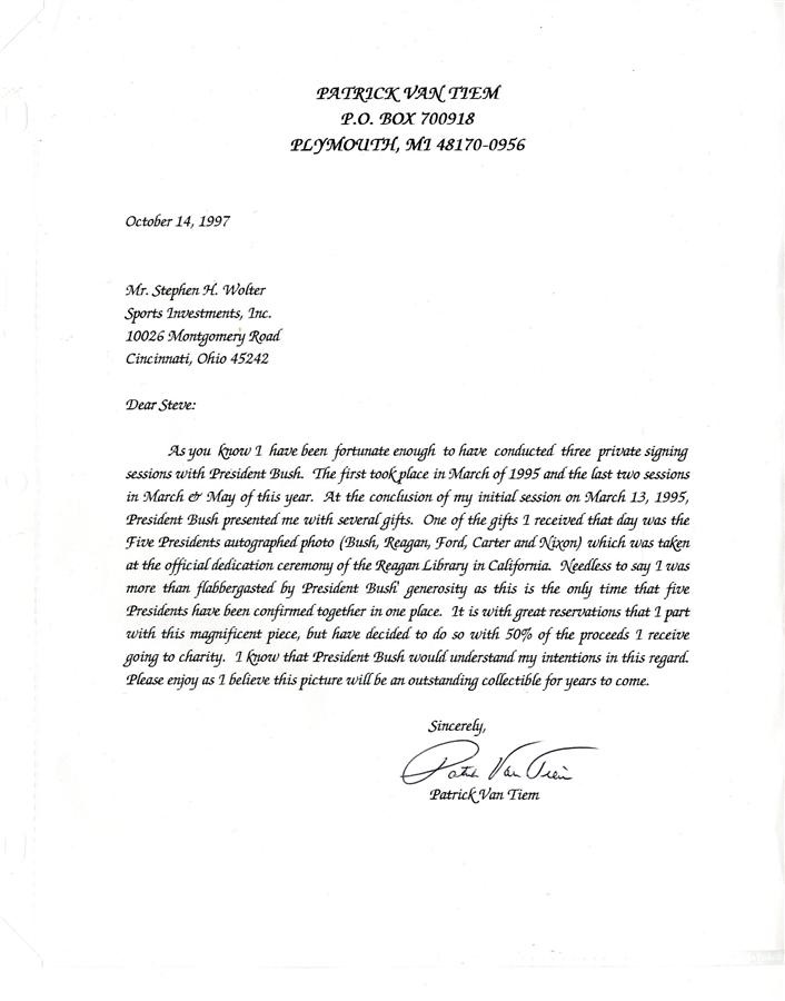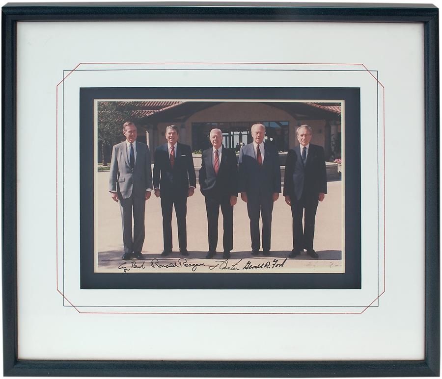 Five of the most powerful men in world history stand side by side in this signed photo, which was a personal gift from President George H.W. Bush and comes with an LOA detailing the history. The shot, which has been framed and matted, was taken at the opening of the Ronald Reagan Library, which was dedicated in 1991. The photo appears NRMT and has been signed in 8/10 black ink/felt tip by Bush, Reagan, Jimmy Carter and Gerald Ford. It is also signed by Richard Nixon but unfortunately his signature has faded badly and is barely visible.