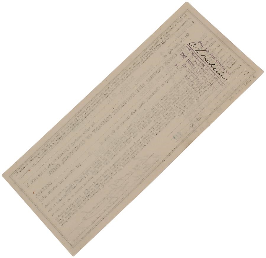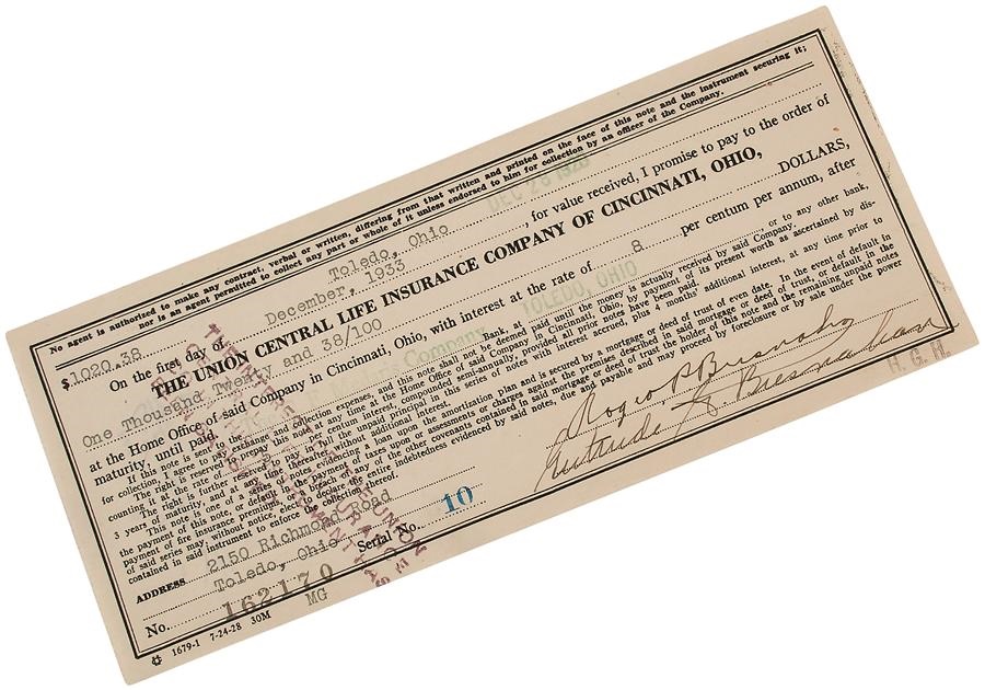 Hall of Fame catcher and manager Roger Bresnahan helped lead the New York Giants to the 1905 World Series title, and this 1928 Life Insurance voucher is signed at the bottom right by Bresnahan and his wife, Gertrude, in 8/10 fountain ink. This is a tough autograph to find and the 1933 document is in EX condition. Bresnahan died of a heart attack 11 years later, at age 65, in his hometown of Toledo, Ohio.