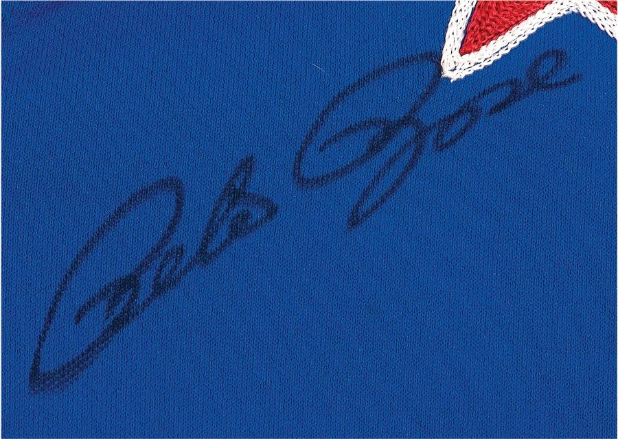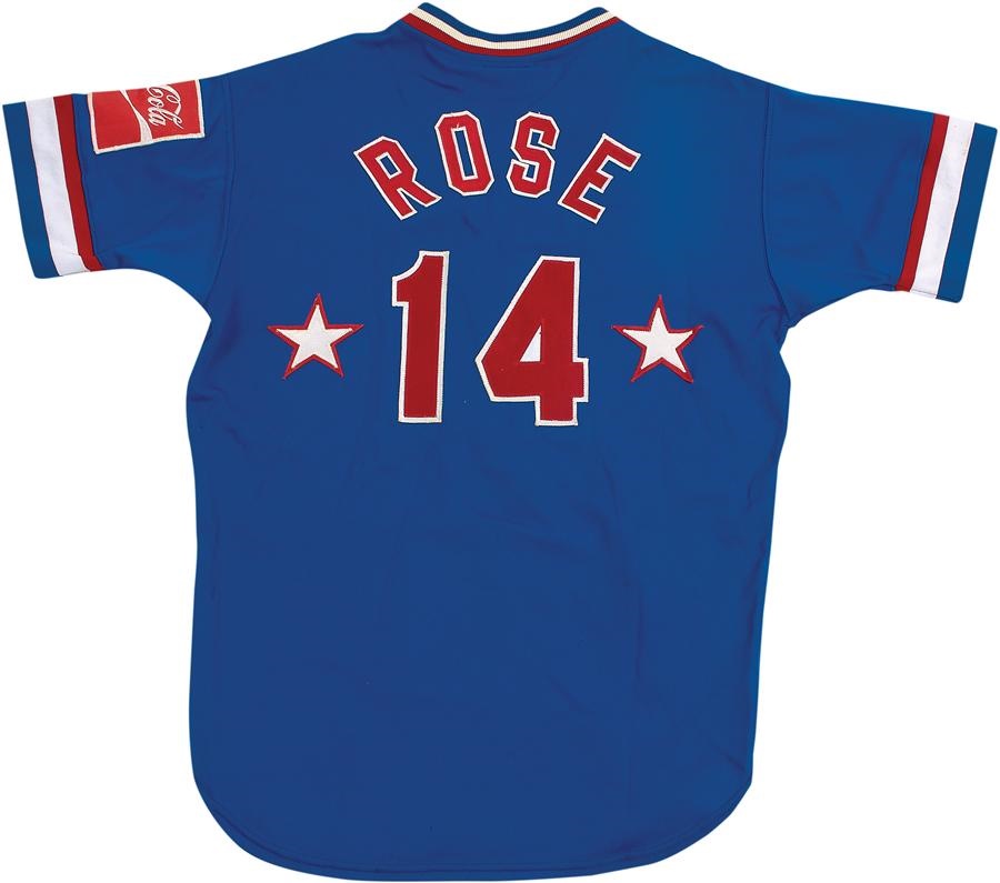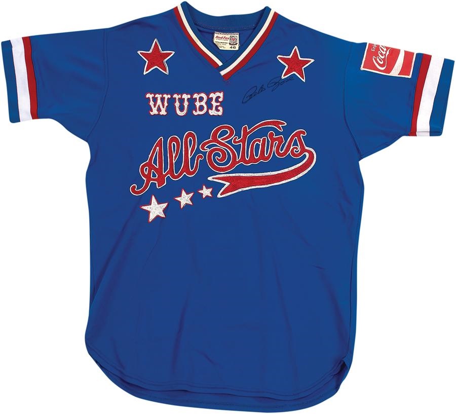 What a stringer! As part of a promotion with Cincinnati radio station WUBE, Pete Rose played softball in this blue jersey with red and white trim, signing his name in black. The front of the jersey showcases a "WUBE All Stars" nameplate, while the back features a "ROSE" nameplate. There's a Coca-Cola patch on the left sleeve and the jersey is Size 46.