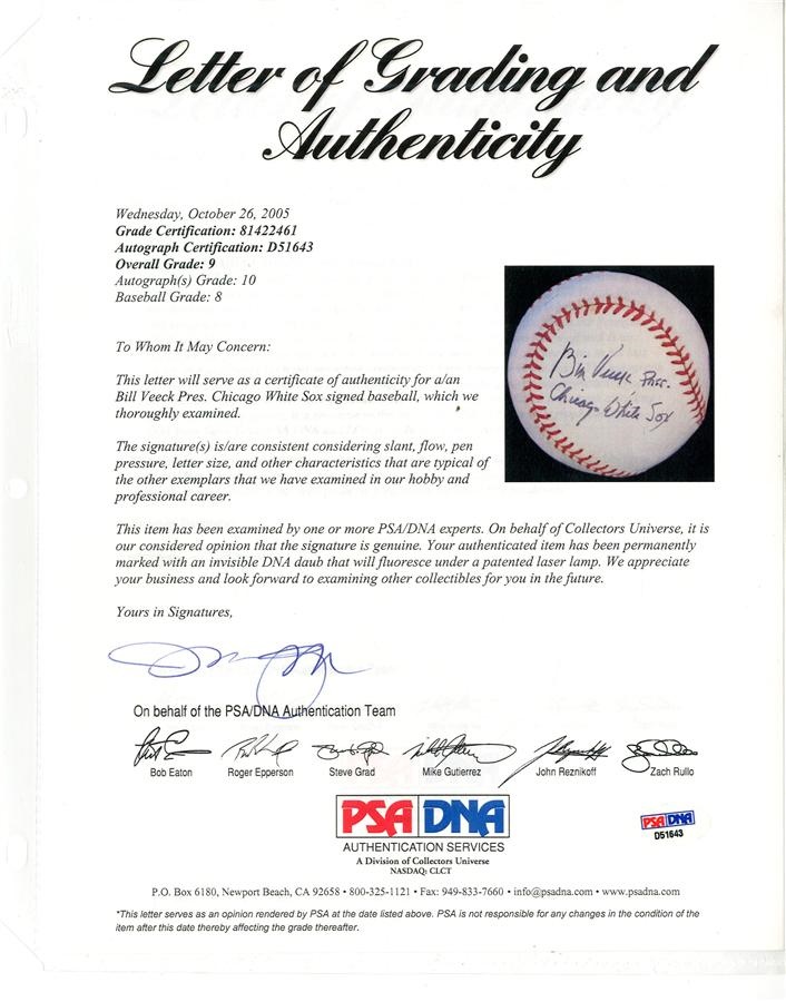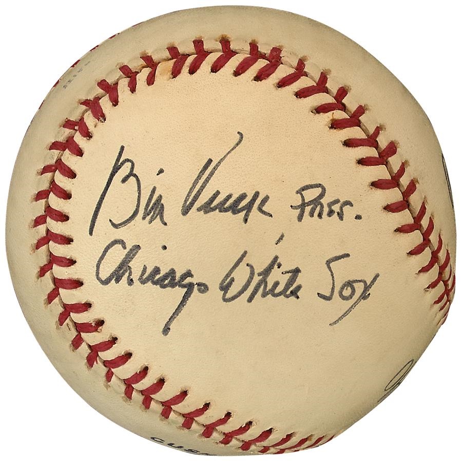Innovative baseball owner Bill Veeck is the sole signer of this official League Haiti baseball, on which he inscribed: "Bill Veeck Pres., Chicago White Sox" on a side panel. The ball is graded Overall PSA 9 with 10 autograph. Comes with PSA/DNA and JSA LOAs.