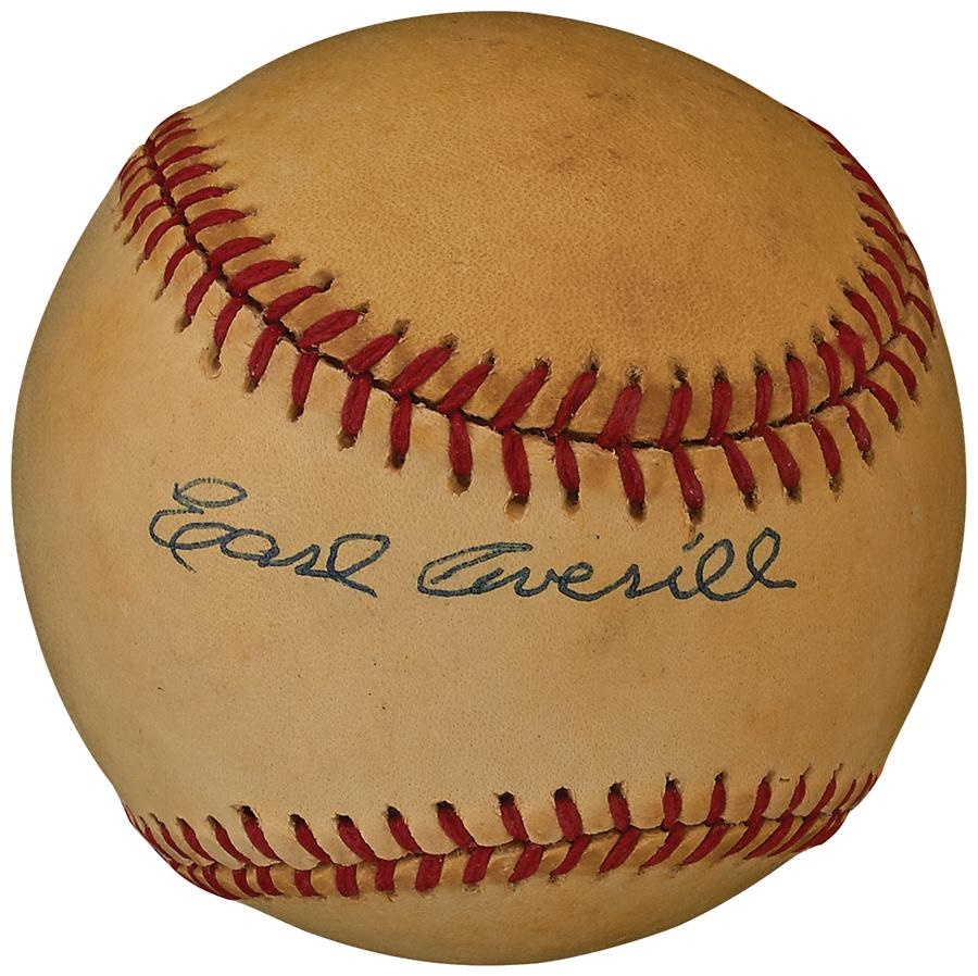He played nearly a century ago but still holds the Cleveland Indians records for runs, RBI and total bases. Hall of Fame center fielder Earl Averill single-signed this official American League (MacPhail) baseball on the sweet spot in strong blue pen. A winner all the way.