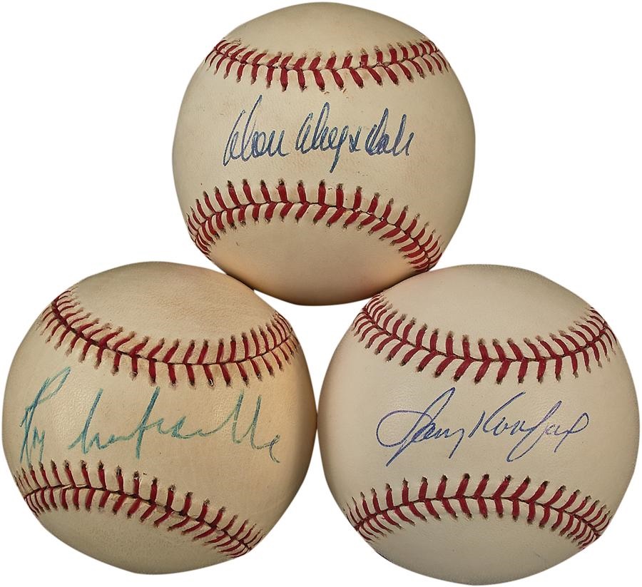 Three Brooklyn Dodger Legends are commemorated in this terrific lot. This is how it breaks down: Roy Campanella (post-accident signature) on an official National League (Giamatti) baseball with PSA LOA, Sandy Koufax on an official Major League baseball with MLB hologram, OA hologram and Steiner COA; and Don Drysdale, who signed on the sweet spot of an official National League (White) baseball.