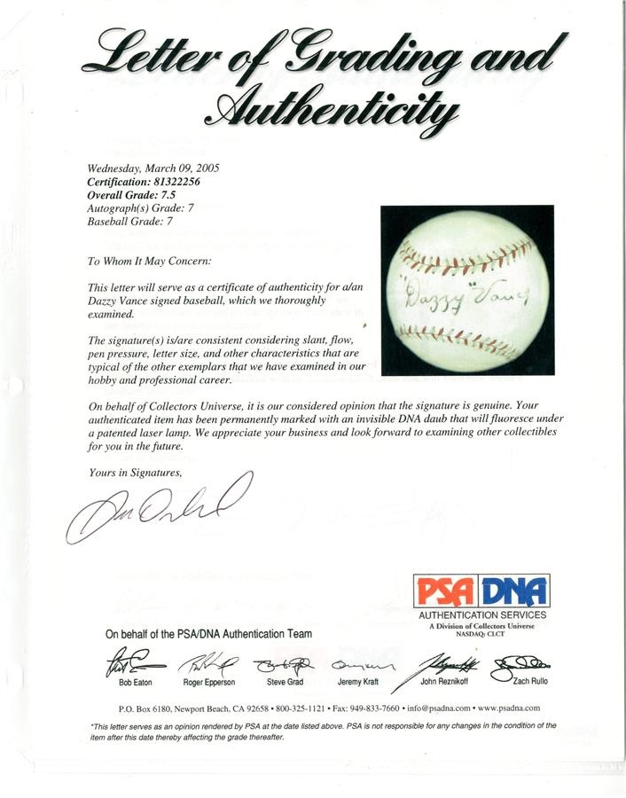 Lot # 523: Dazzy Vance Single Signed Baseball PSA 7.5