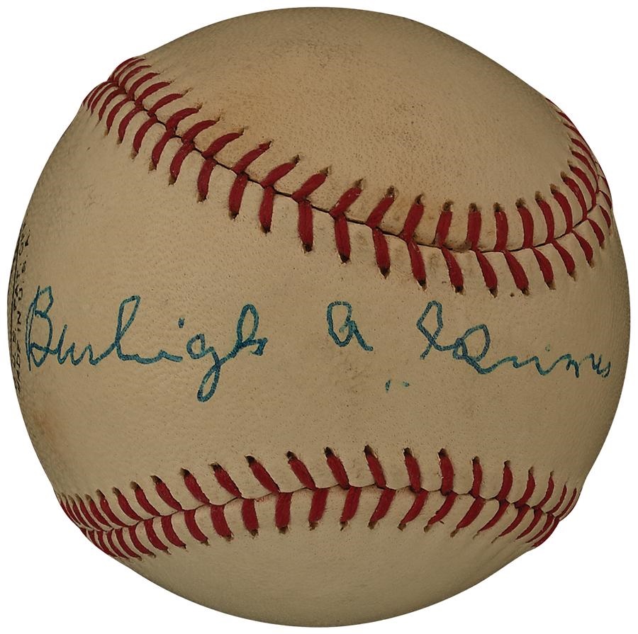 The last pitcher permitted to throw a spitball, Burleigh Grimes signed the sweet spot of this official National League (Giles) baseball. The Hall of Famer won 270 major league games and pitched in four World Series over the course of his 19-year career.