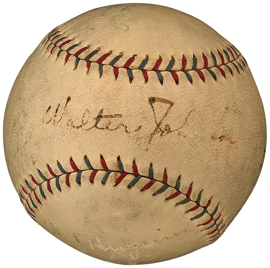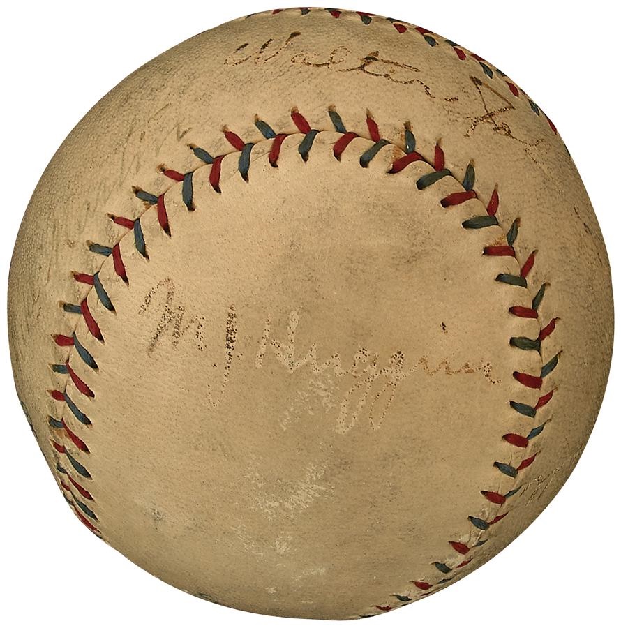 Two of the best in their respective fields - Hall of Fame pitcher Walter Johnson (SS) and Hall of Fame skipper Miller Huggins - both signed this 1929-31 official American League Reach Barnard baseball. Senators trainer Mike Martin (2x) also signed the ball, which is in VG-EX condition with Johnson and Huggins signatures 5/10 and 3/10 respectfully.