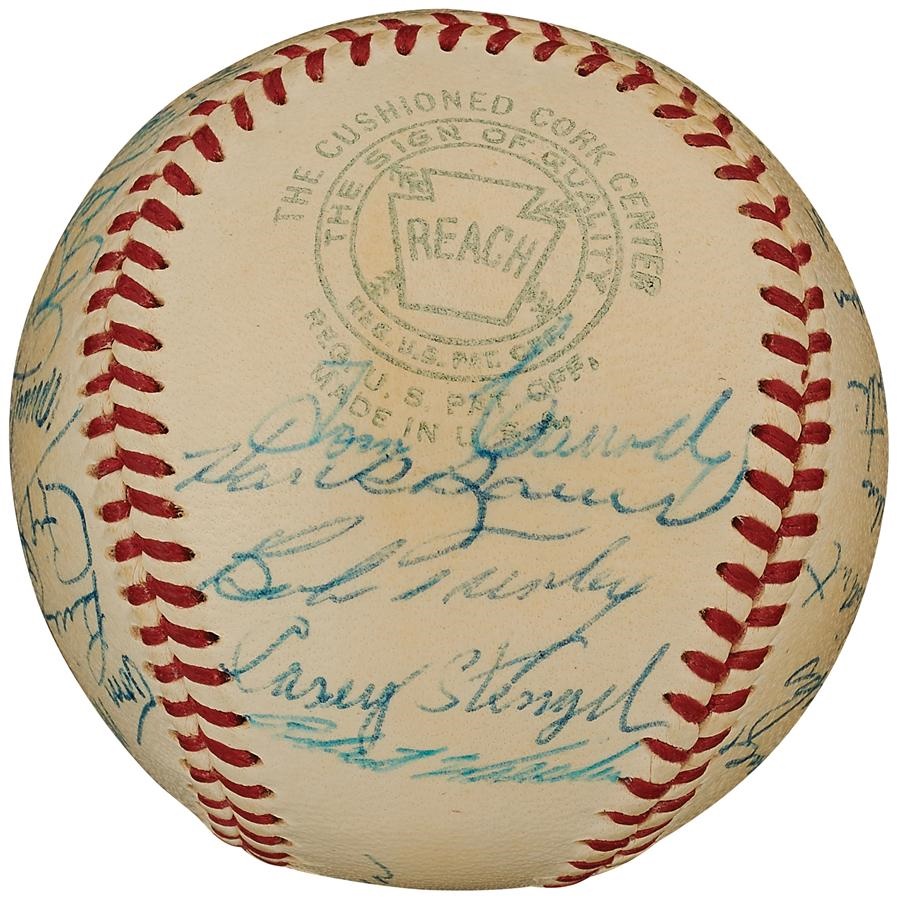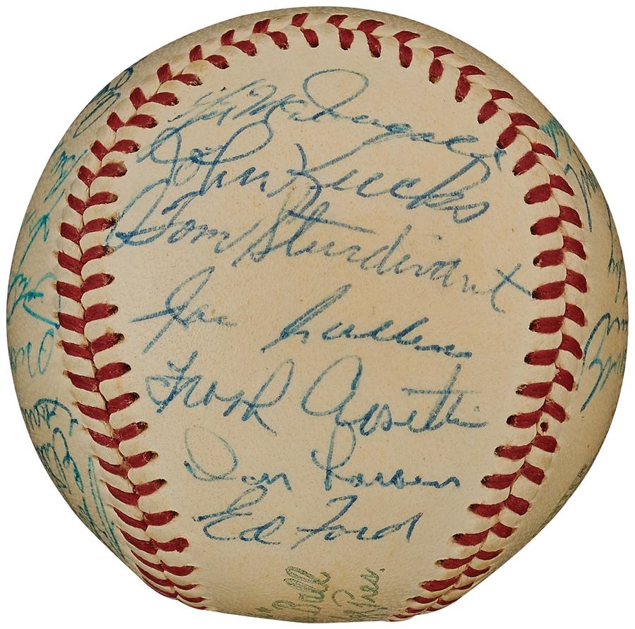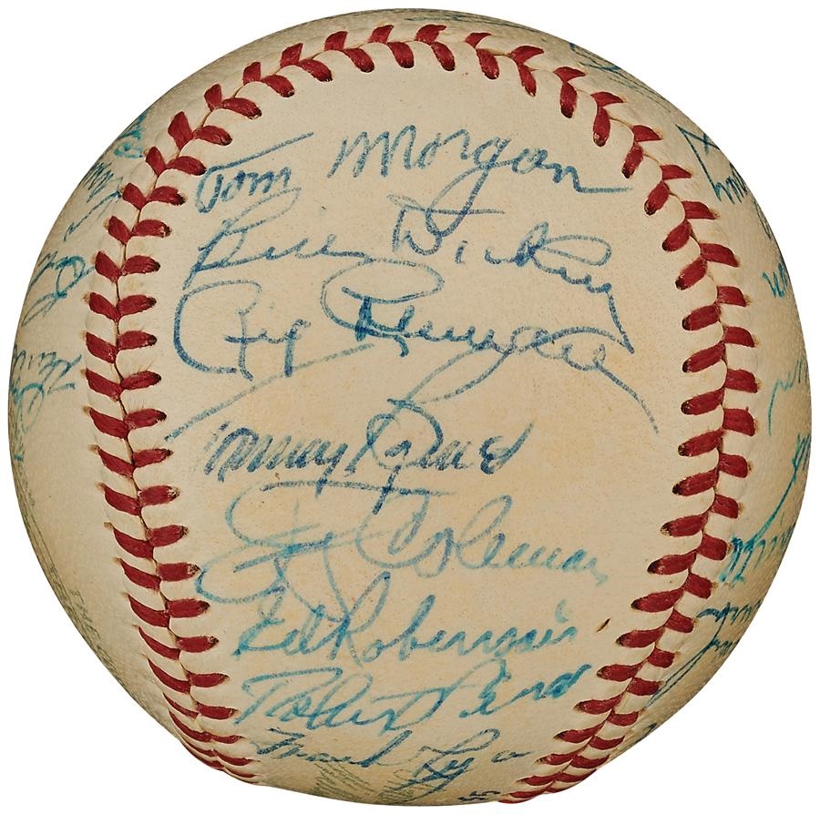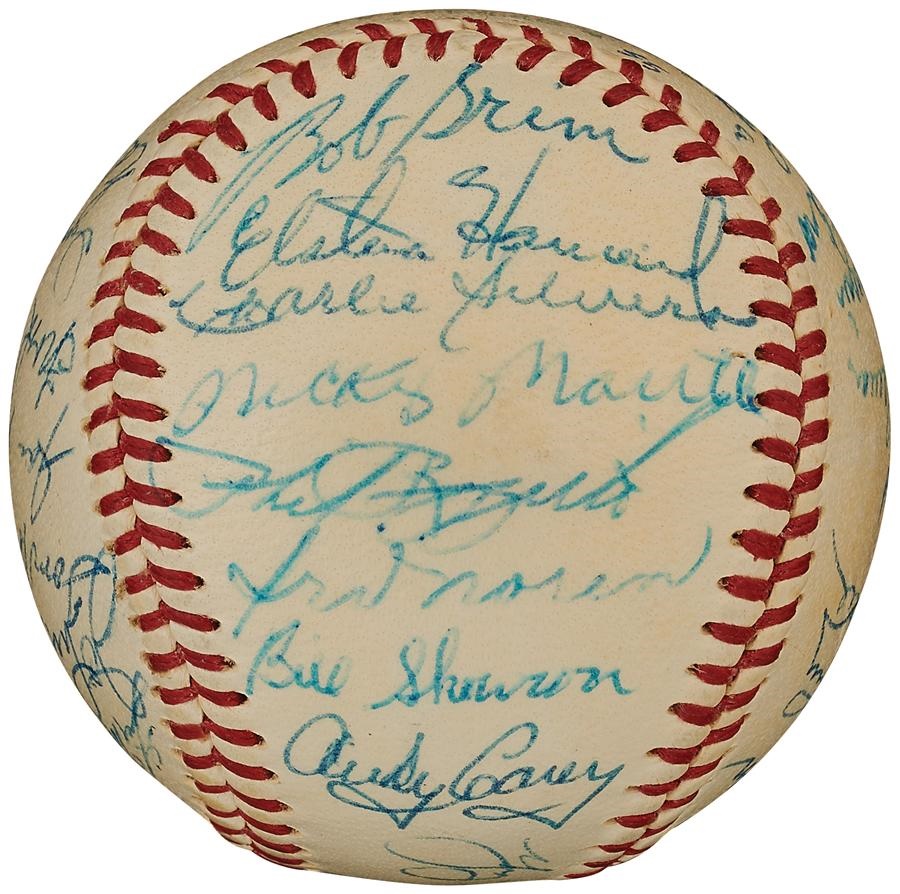 It was the first time ever that Yankee Fans had to bow to Dodger fans in the Big Apple as the Bums finally had their day, winning their first and only World Series in the borough of Brooklyn. The season was still a success for the Bronx Bombers, who cruised to their record 21st pennant with a 96-58 record, and this official American League (Harridge) baseball boasts 29 blue ink signatures that average 8/10. Included in the mix are: Stengel, Mantle, Larsen, Ford, Dickey, Berra, Howard and more. The ball is in NRMT-MT condition.