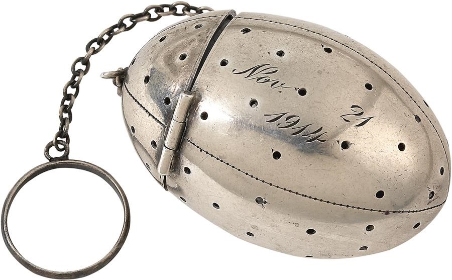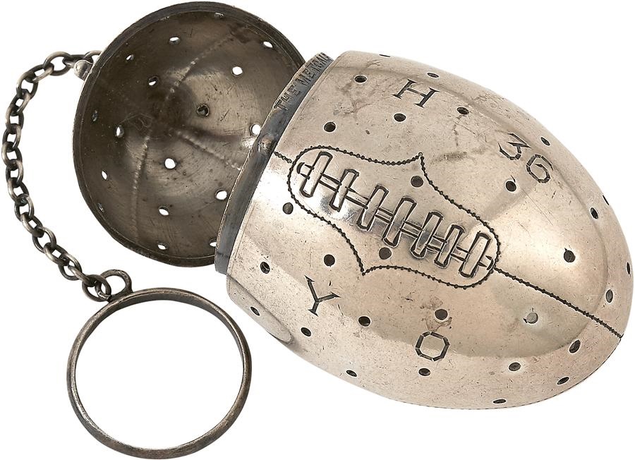 This sterling silver tea infuser commemorates the Nov. 21st 1914, HARVARD vs YALE football game, which Harvard won 36-0. This was the first game played at the Yale Bowl and attending the game were luminaries from every major city, including the then-Governor of Hawaii. Presidents William Howard Taft and Theodore Roosevelt were also reported to be in attendance. The tea infuser is in the shape of a football, measures 2.5" high, and was made by the Metcalf Co. NYC. Reads "Nov 21, 1914" and "H 36 Y 0". Condition is NRMT.