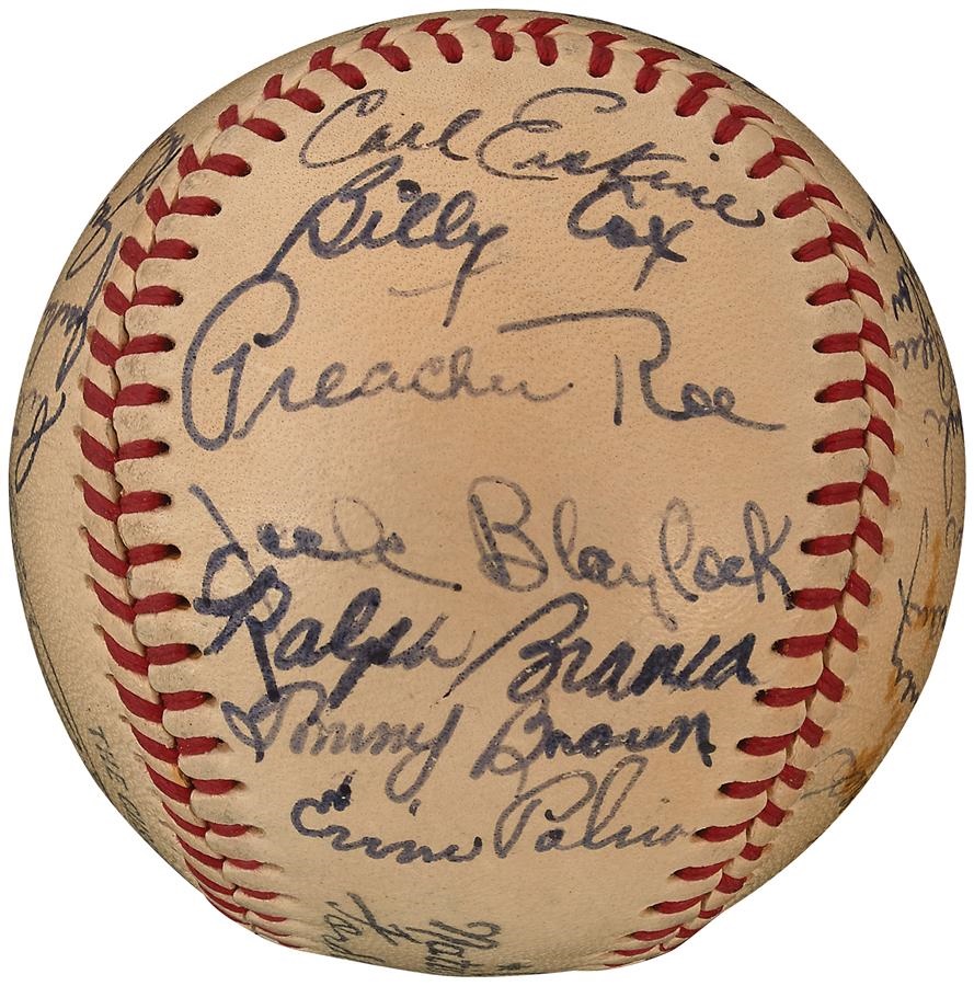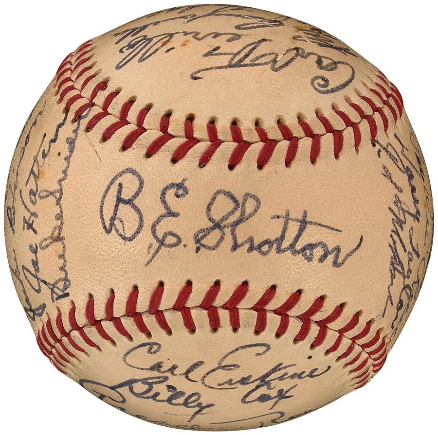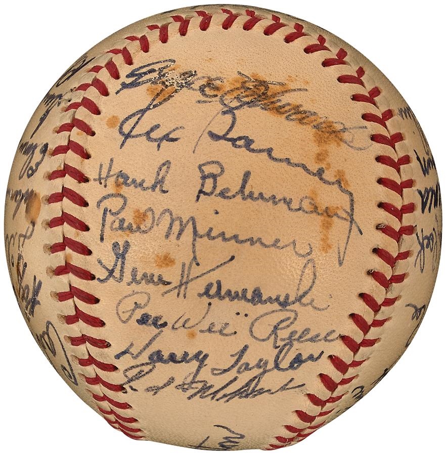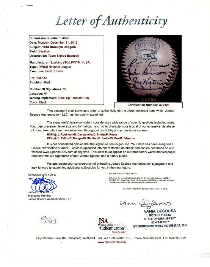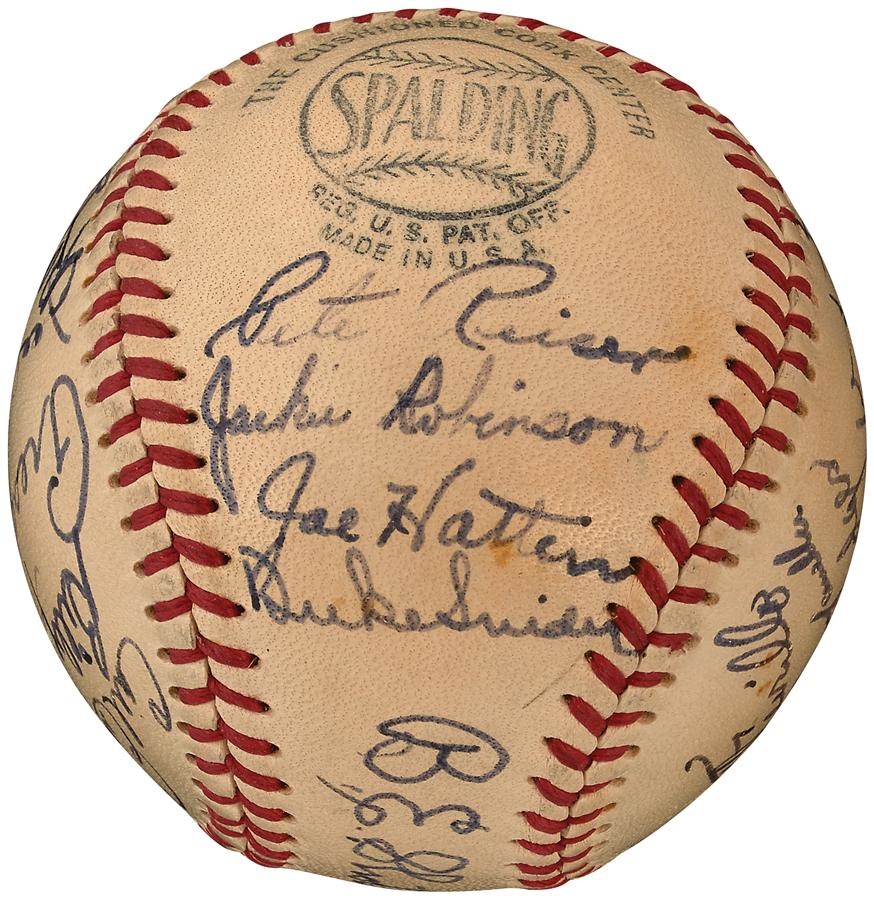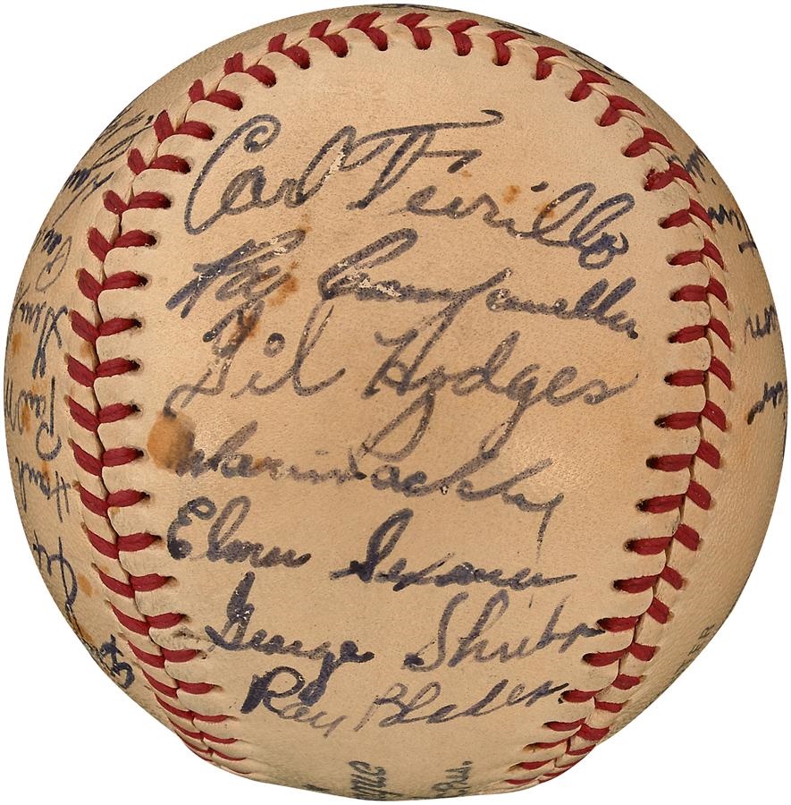 1948 was a tumultuous time for the Brooklyn Dodgers, with roster upheaval and the ouster of manager Leo Durocher. This official National League (Frick) baseball is NRMT but for a few small brown spots on two of the panels and contains 27 signatures, none of which are clubhouse. They include: Campy (rookie), Robinson, Furillo, Hodges, Erskine, Branca, Snider, Shotten, Reese and the rest of the gang. The signatures are in black ink and average 8/10. The relic originates from the Carl Erskine collection and comes with his signed LOA as well as a TJSA LOA.