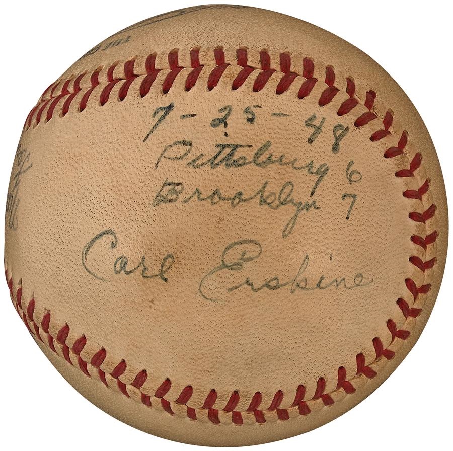 One of Brooklyn's favorite pitchers during the 1950s, Carl Erskine earned the win in his major league debut on July 25, 1948, pitching a scoreless inning of relief in the Dodgers' 7-6 come-from-behind win at Forbes Field. Here's the very baseball that served as the final out of that game, and it comes directly from the collection of Erskine with a Lelands LOA. The official National League (Frick) baseball, which appears MT, shows use and features the following notation in Erskine's own hand in 7/10 ink: "7-25-48, Pittsburg 6, Brooklyn 7, Carl Erskine."