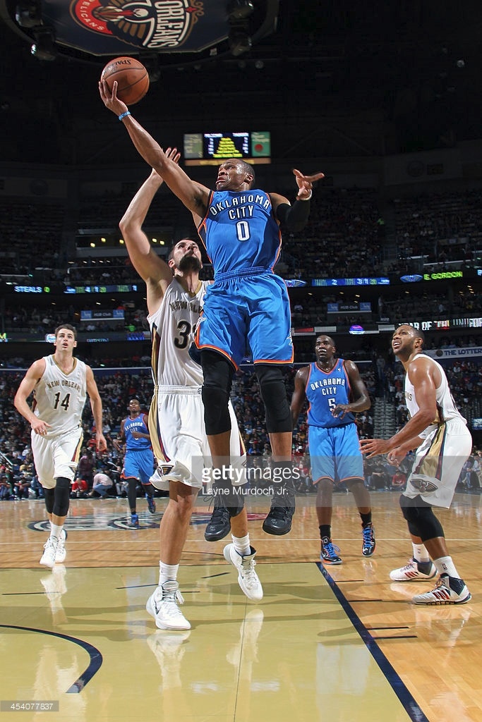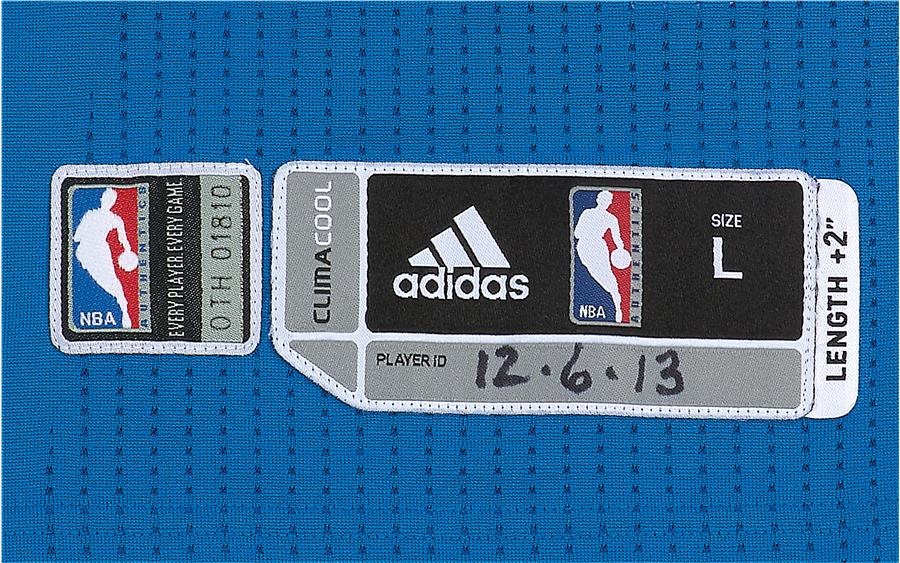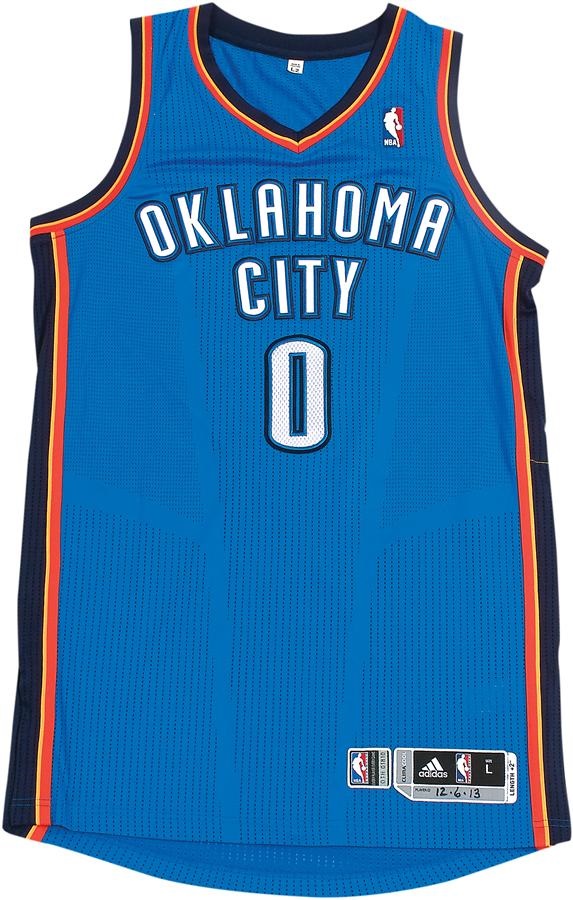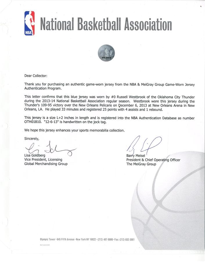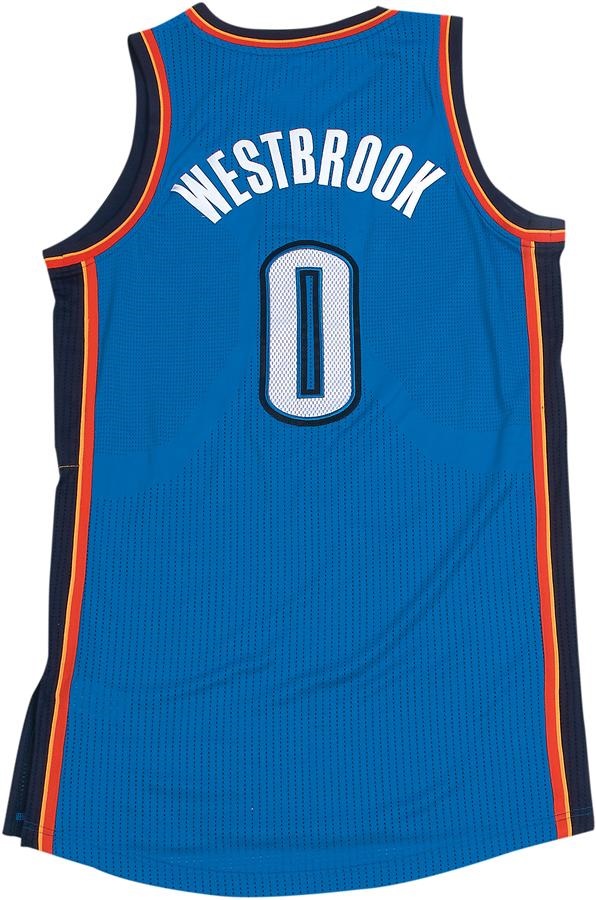 Four-time NBA All-Star Russell Westbrook donned this colorful blue road jersey on December 6, 2013, when his Oklahoma City Thunder played at the New Orleans Pelicans. "12-6-13" is written on a jock tag, the size is L+2 inches with registered number "OTH01810" Comes with a Meigray LOA. Westbrook - who was one of the last draft picks ever by the now-defunct Seattle SuperSonics - recorded 25 points, four assists and a rebound the day he wore this jersey.
