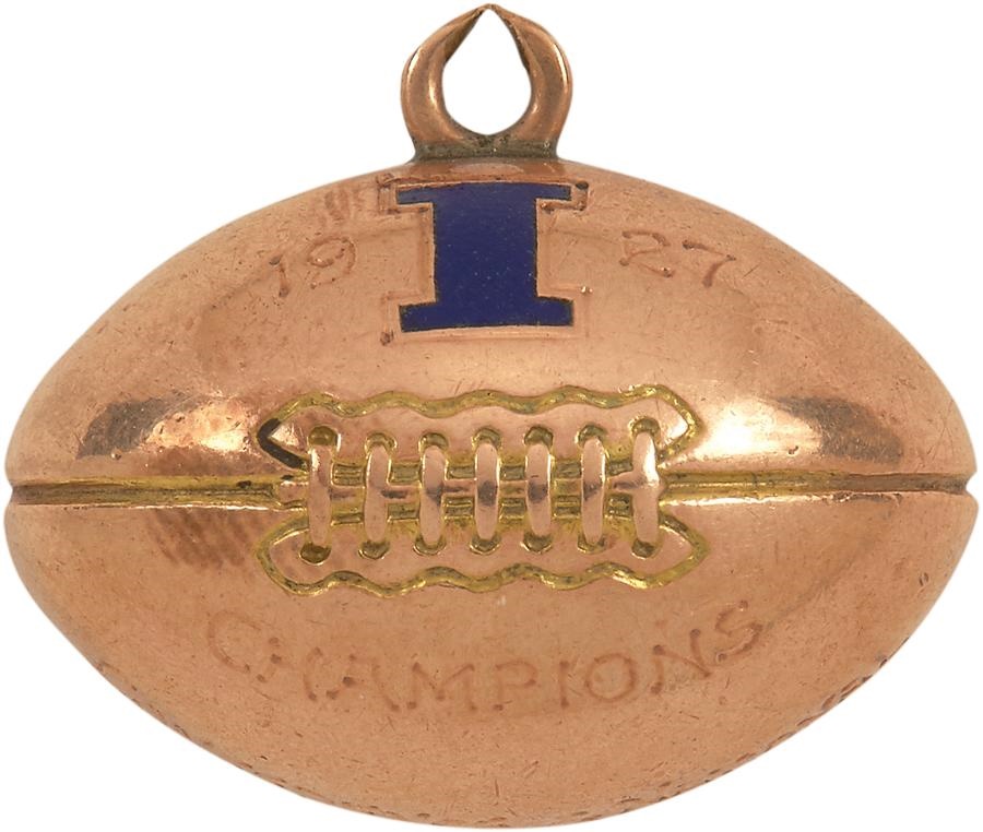 Though other teams have since claimed the crown, the 1927 University of Illinois football team was named National Champions, compiling a 7-0-1 record while outscoring their opponents 152-24. This genuine gold pendant in the shape of a football (complete with laces) was presented to team member W. McClure in much the same fashion as rings are distributed today. The jewelry is distinguished by a blue enamel "I" with "1927 Champions" engraved on one side. On the other side is "W. McClure, Kicker Guard." It is in EX condition.