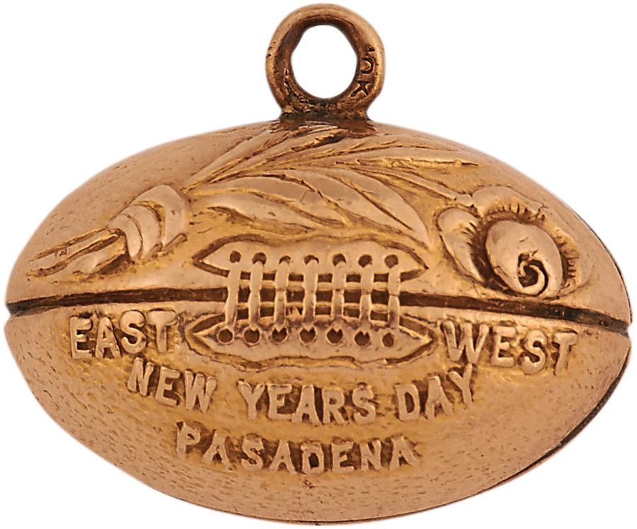 This gold football-shaped medal was presented to western John Ford actor Ward Bond in 1930 while playing football for the University of Southern California. Bond was a starting lineman on USC's first National Championship team, and he was a close teammate and associate of John Wayne, who as Marion Robert Morrison had played tackle for USC. Bond was prolific in making movies throughout his career. The football medal measures 1" and is engraved "East-West New Year's Day Pasadena" and "USC 47 Pittsburgh 14 1930" - in NRMT condition.