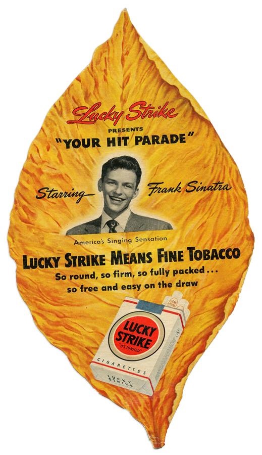 Shaped like a tobacco leaf and featuring a black-and-white image of a young Frank Sinatra, this is a scarce, large-size premium advertisement for Lucky Strike cigarettes, which "presents Your Hit Parade." Measuring roughly 7.5x13", the ad is in EX+ condition.