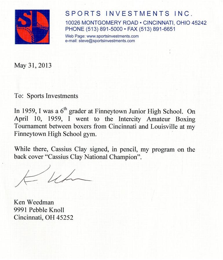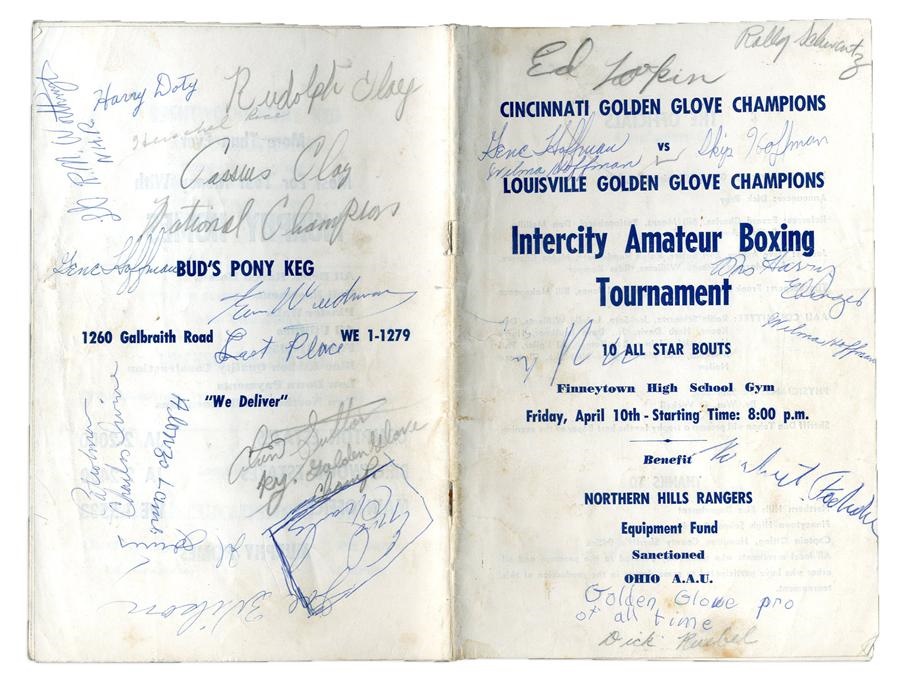 This Golden Glove Intercity Amateur Boxing Tournament was one of the earliest events young Cassius Clay ever participated in and, of course, won. With enough bravado to sign "Cassius Clay National Champion" he still was unknown and young enough to be one autograph among many. This is the rarest of rare programs for the Cincinnati Golden Glove Champions vs. Louisville Golden Glove Champions held at the Finneytown High School Gym. Program is 6x9" and has many childlike signatures and writing all over the 20-page book. It is missing a couple of pages inside and has minor soiling and creasing. His signature is on the back page right above an advertisement for "Bud's Pony Key" with a local address and "We Deliver." Comes with a letter from the original owner who was in the 6th grade and went to the event, and had Cassius Clay sign in person on the back cover.