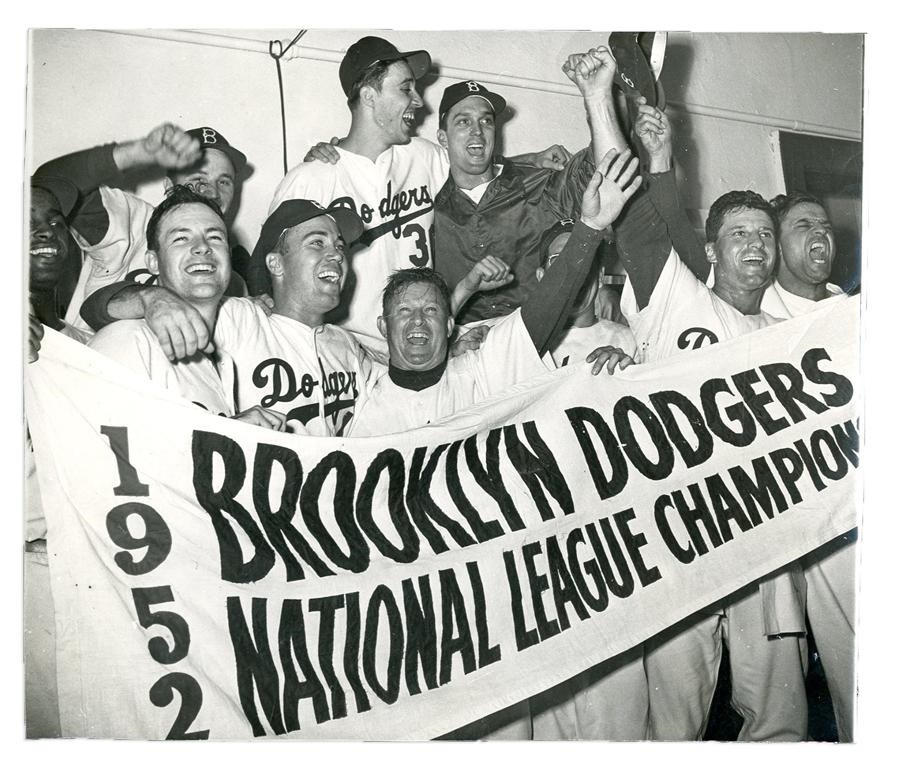 Great image on type I photo by the in-house Brooklyn Dodgers photographer Barney Stein (name in pencil on verso) of the 1952 Brooklyn Dodgers celebrating their rebound to win the National League pennant by four games over the New York Giants. Photo measures 8x9" and is EX.